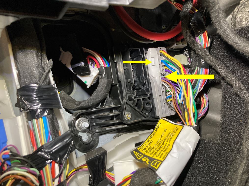 NoteSqueeze the release tab on the LH front seat connector lock, and then swing the lock away from the connector to release the lock.CAUTIONDo not pull on the connector too hard. If the connector does not easily disconnect from the LH body controller, the lock is still engaged.