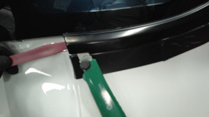 Using a plastic trim tool, pry out the rear edge of the LH quarter brightwork from the LH rear quarter body glass, and then use a retractable blade to cut the urethane that attaches brightwork to the vehicle to remove the trim from the vehicle.