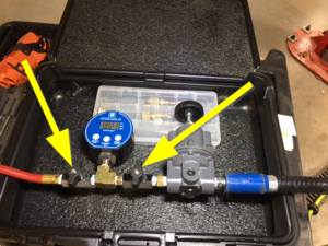 Turn both valve knobs on the enclosure leak tester to the vertical position