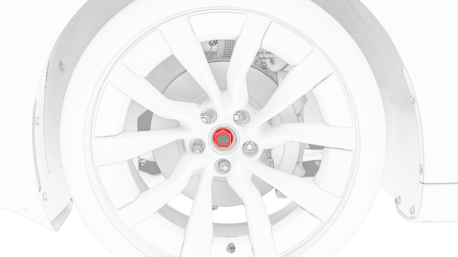 - Position the hydraulic hub puller tool onto the LH front wheel studs, and then hand tighten the wheel lug nuts (x5).