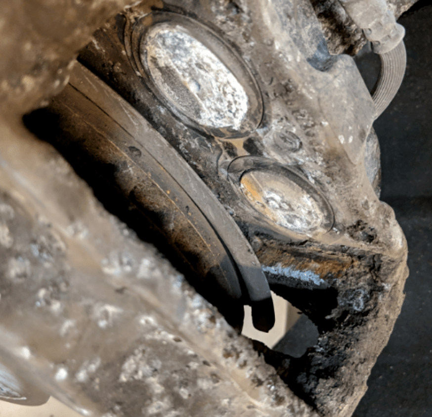 - First use a brake pad puller to remove stuck brake pads before escalating to an air hammer with blunt chisel tip to break the pads free from the caliper.