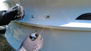 Move the badge removal tool in a sawing motion to separate the rear Tesla