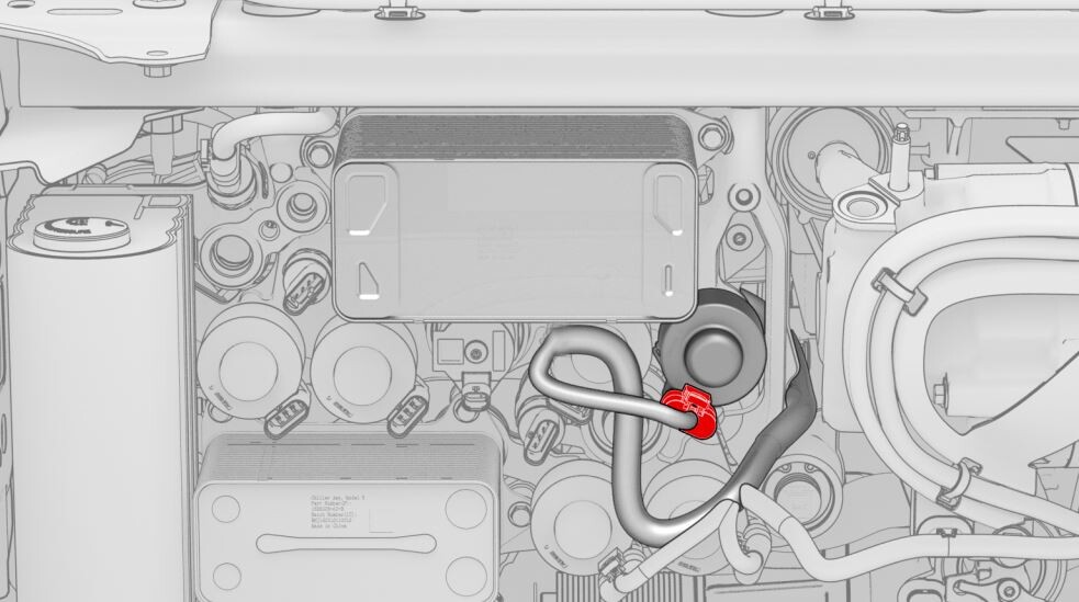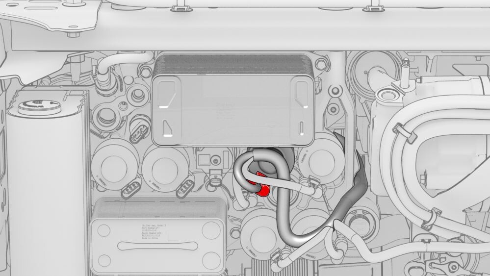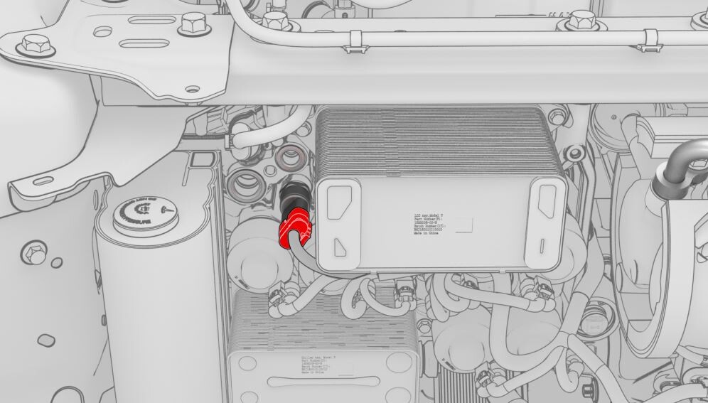 CAUTIONPush the red locking tab towards the connector to engage the locking mechanism. DO NOT push down or pull up on the red locking tab.NoteMatch the color of the tape wrapped around the harness with the color of the sheathe near the coolant hose coupling.