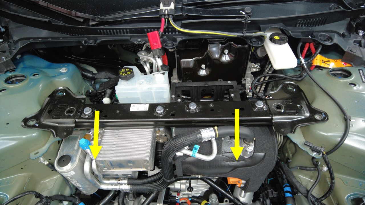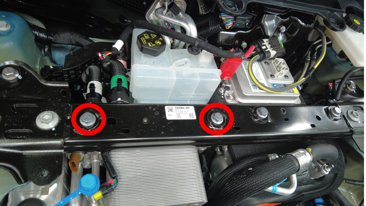 the bolts (x2) that attach the supermanifold to the shock tower brace.