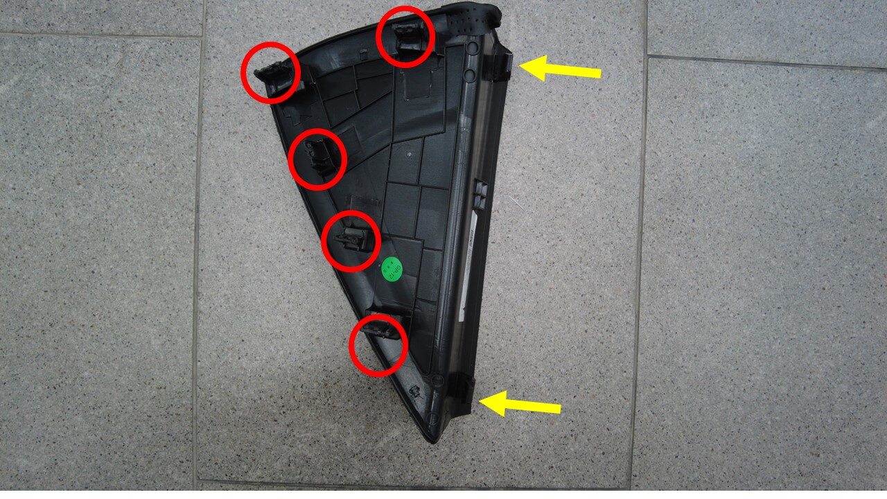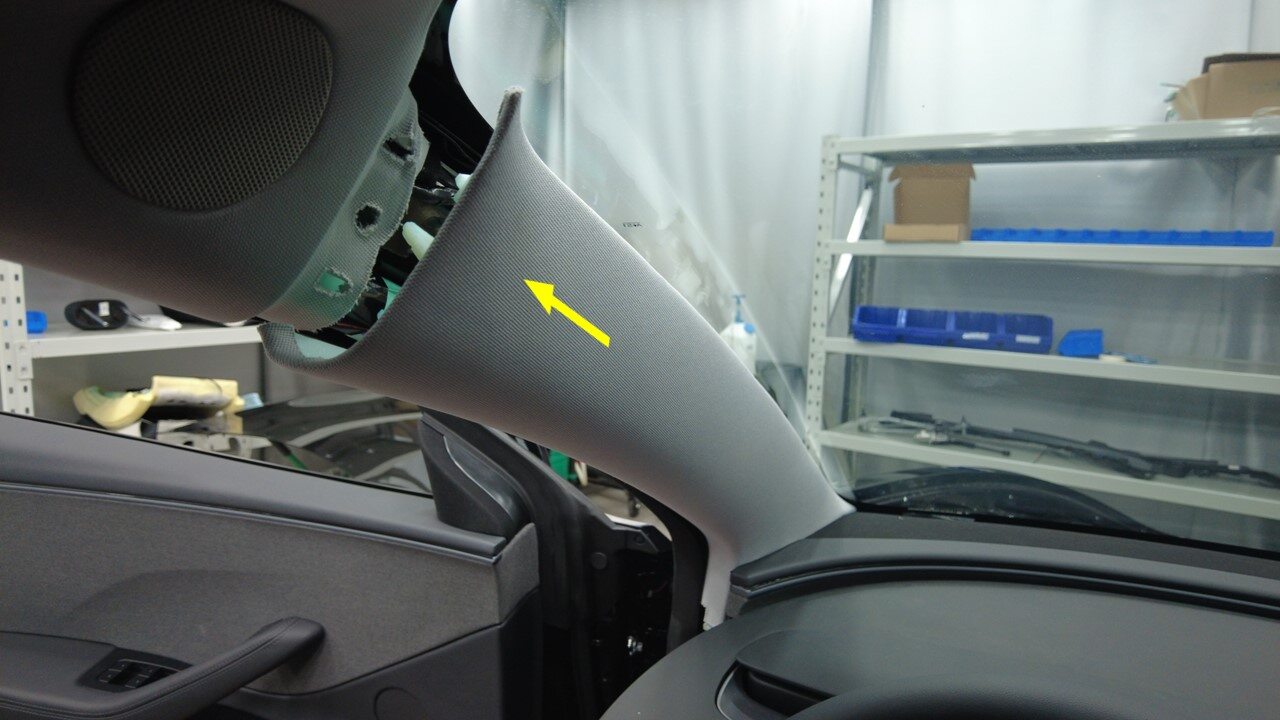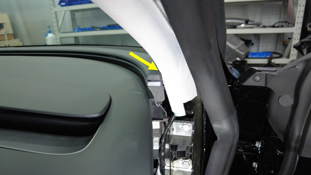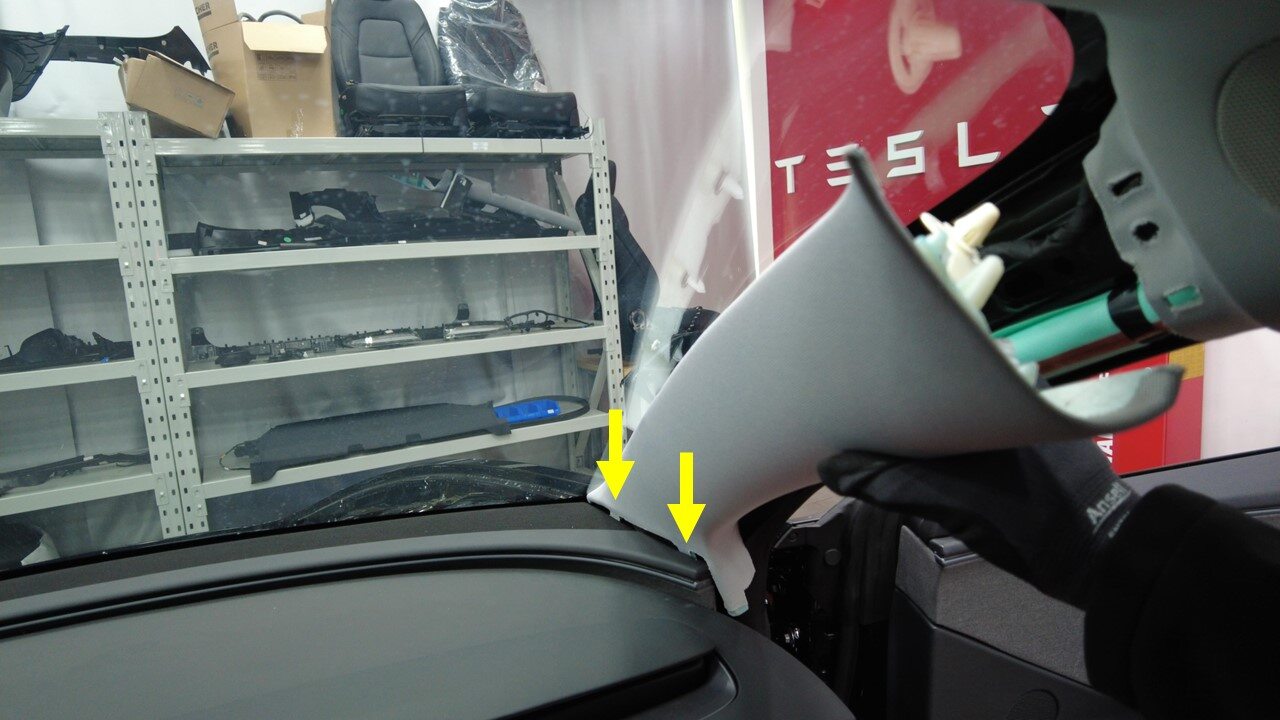 TIpDepress both tabs to release the metal clip and pull the inside of the upper portion of the upper A-pillar. Then, pull the upper A-pillar upward to remove.