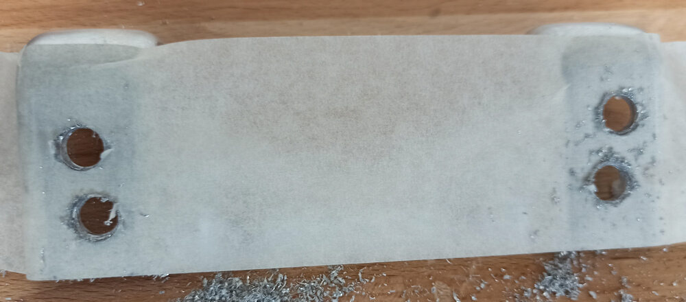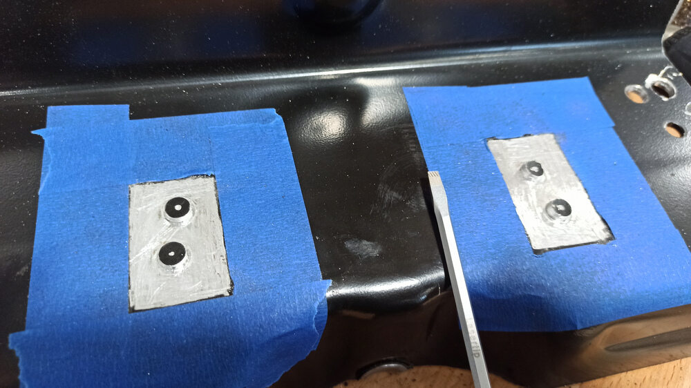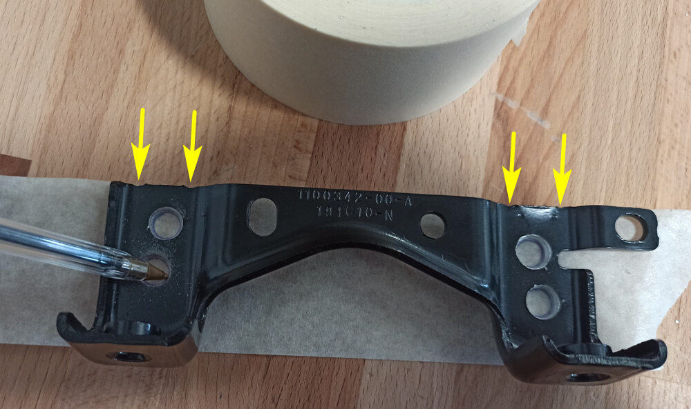 NotaStick the masking tape on the old skid plate bracket along the top edge. Use thin ballpoint pen to mark the holes and the skid plate bracket location on a masking tape piece.