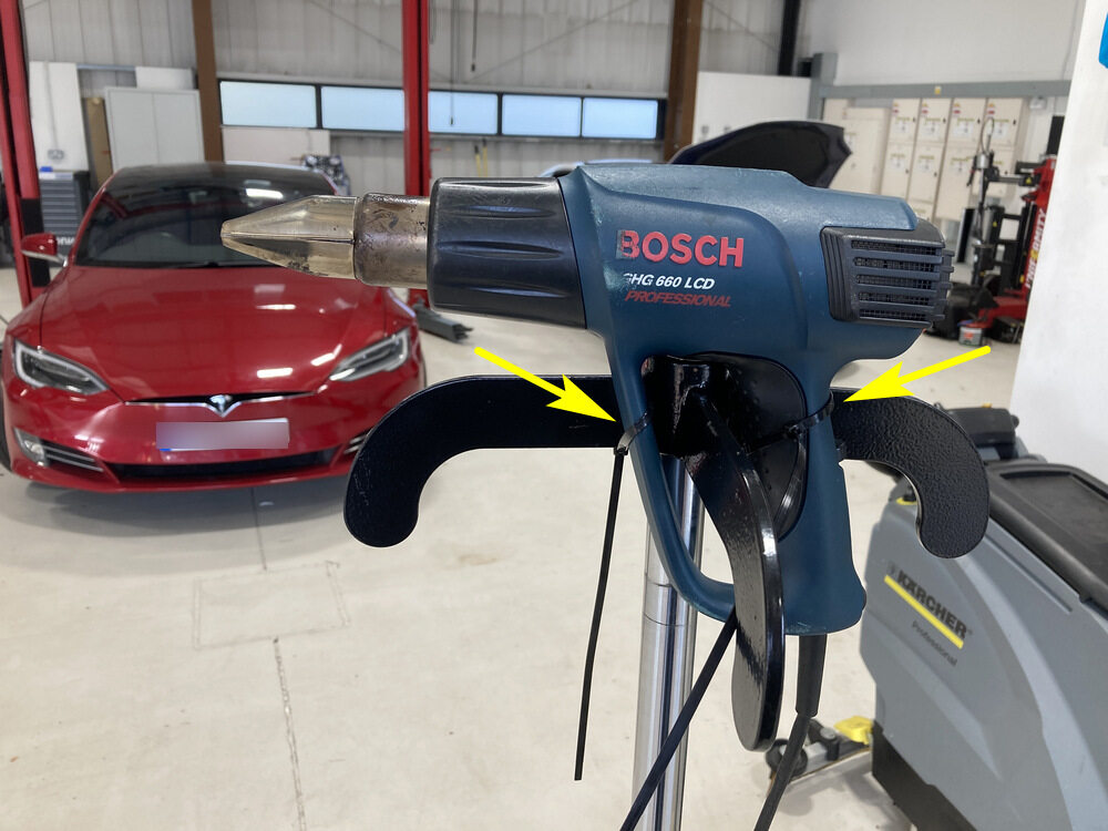 AvisoWhen force curing adhesive in a repair area near the High Voltage Battery, do not allow the High Voltage Battery to reach a temperature above 74°C (165°F). Heating the High Voltage Battery above 74°C (165°F) for an extended period could result in injury to personnel and/or damage to the battery. Attach the Bosch digitally adjustable temperature heat gun to the Transmission Jack with the zip ties. Install it facing the skid plate bracket 10 cm from it curing▪ 7 days at 23 ± 2 °C▪ 2 hours at 65 ± 2 °C.