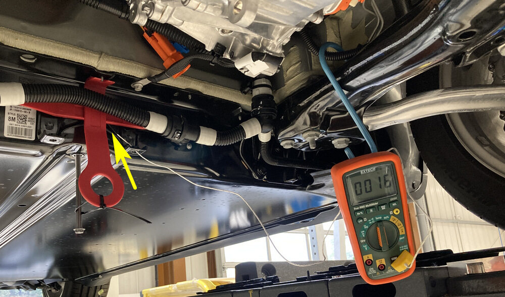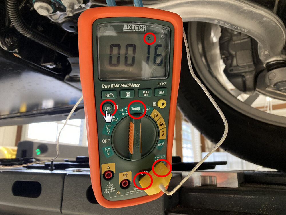 NotaSet up the Digital multimeter with thermocouple attached to it. Be careful with the polarity of the plug. Press LPF button to change from °F to C°. Turn switch to Temp position. Check if the temperature readings are real. Attach thermocouple to the skid plate.