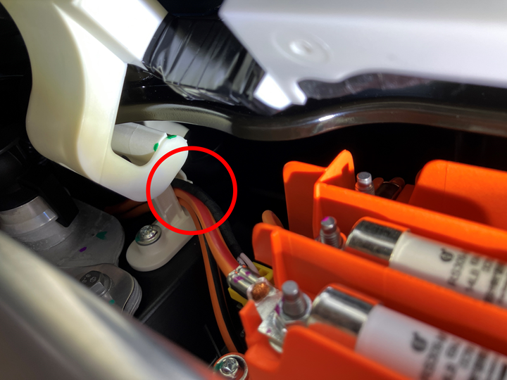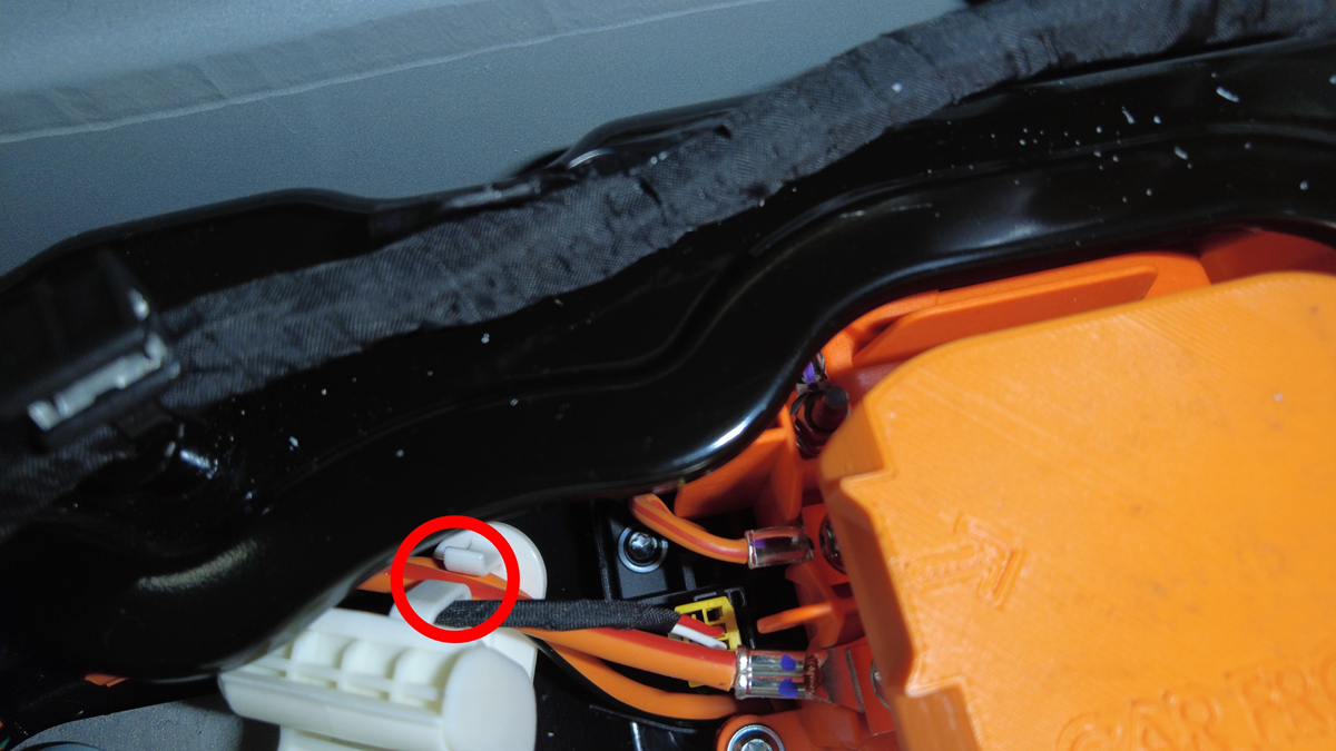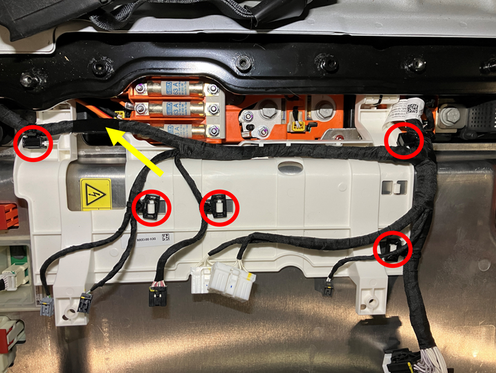 Montieren Sie die 5 Kabelbaumclips und das Klebeband zur Befestigung des Kabelbaums des HV-Gehäuses am Scharnierblech des HV-Steuergeräts.