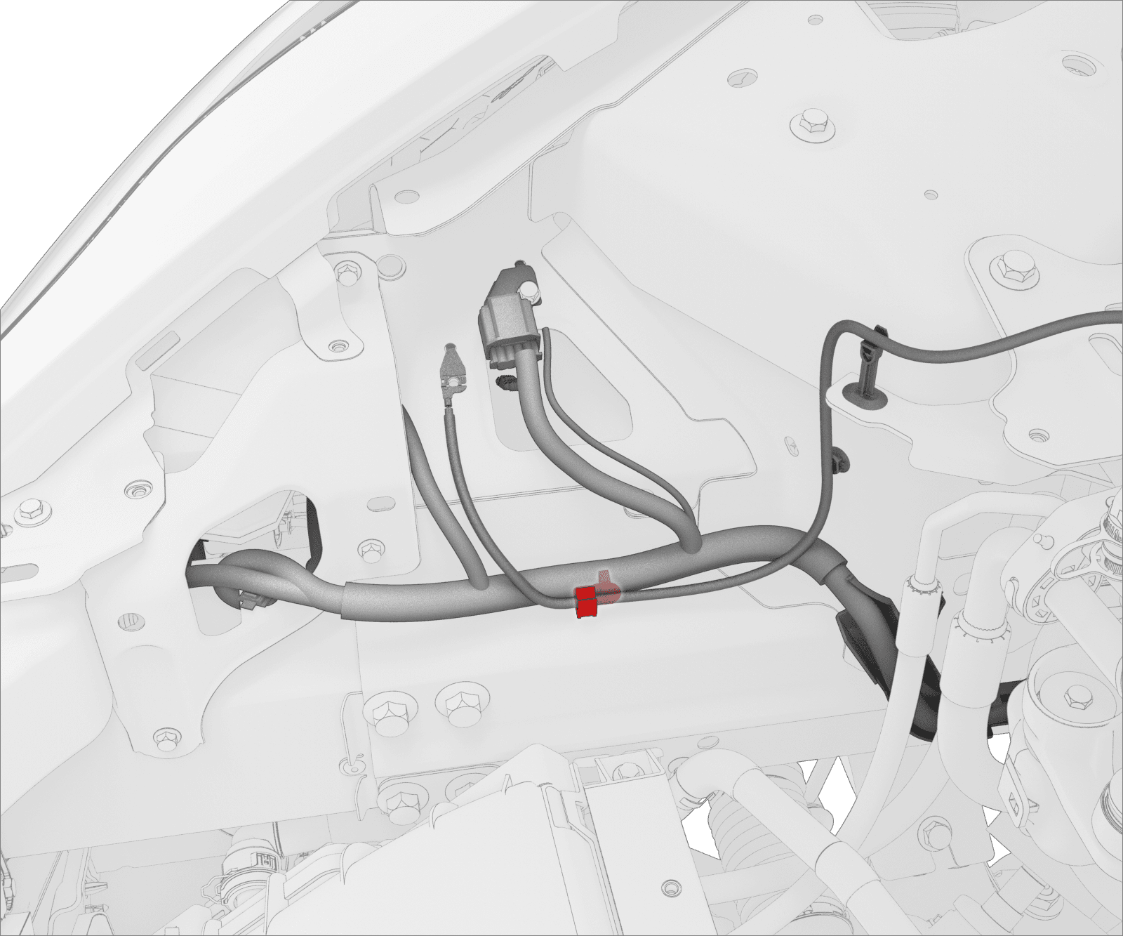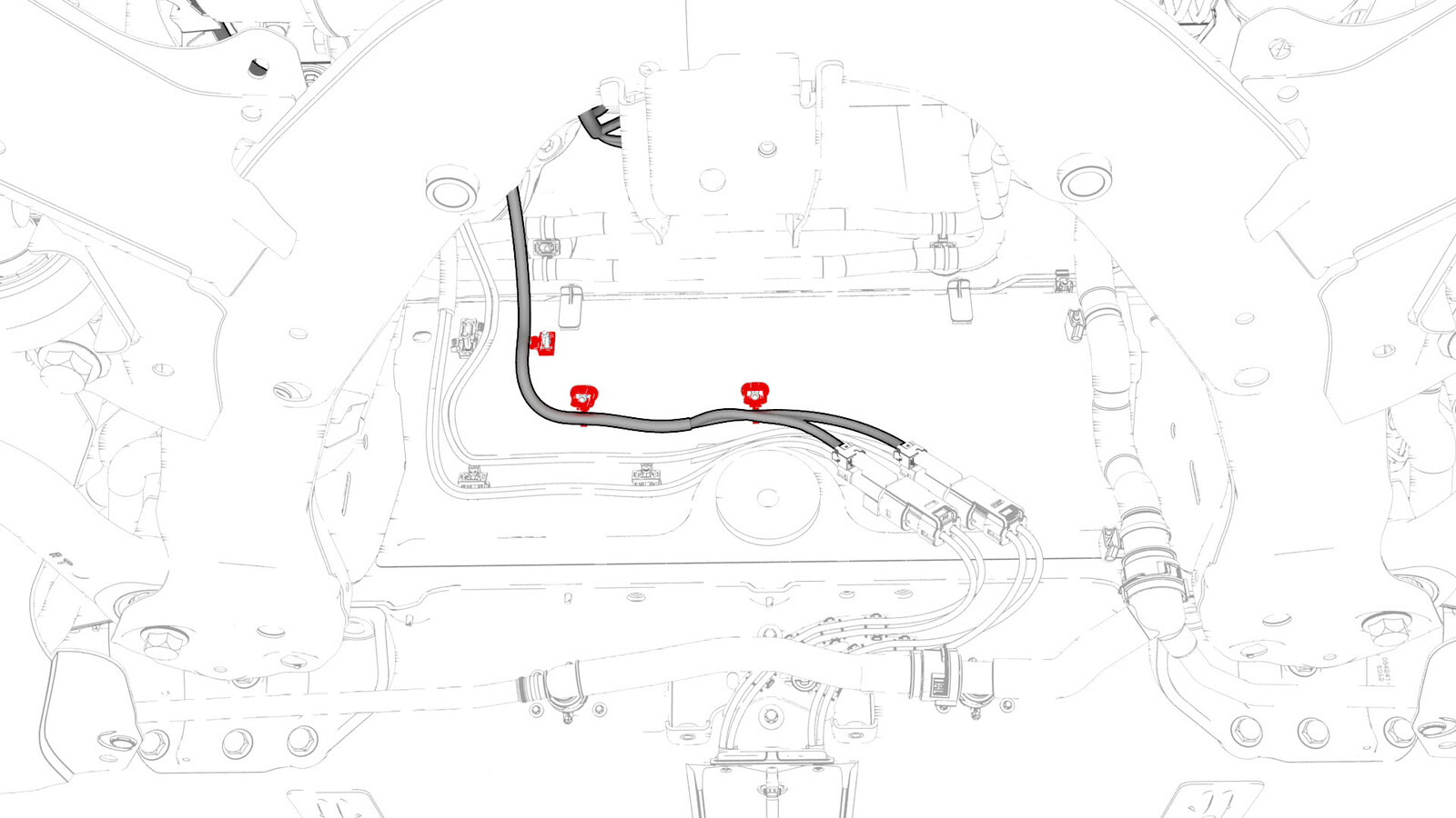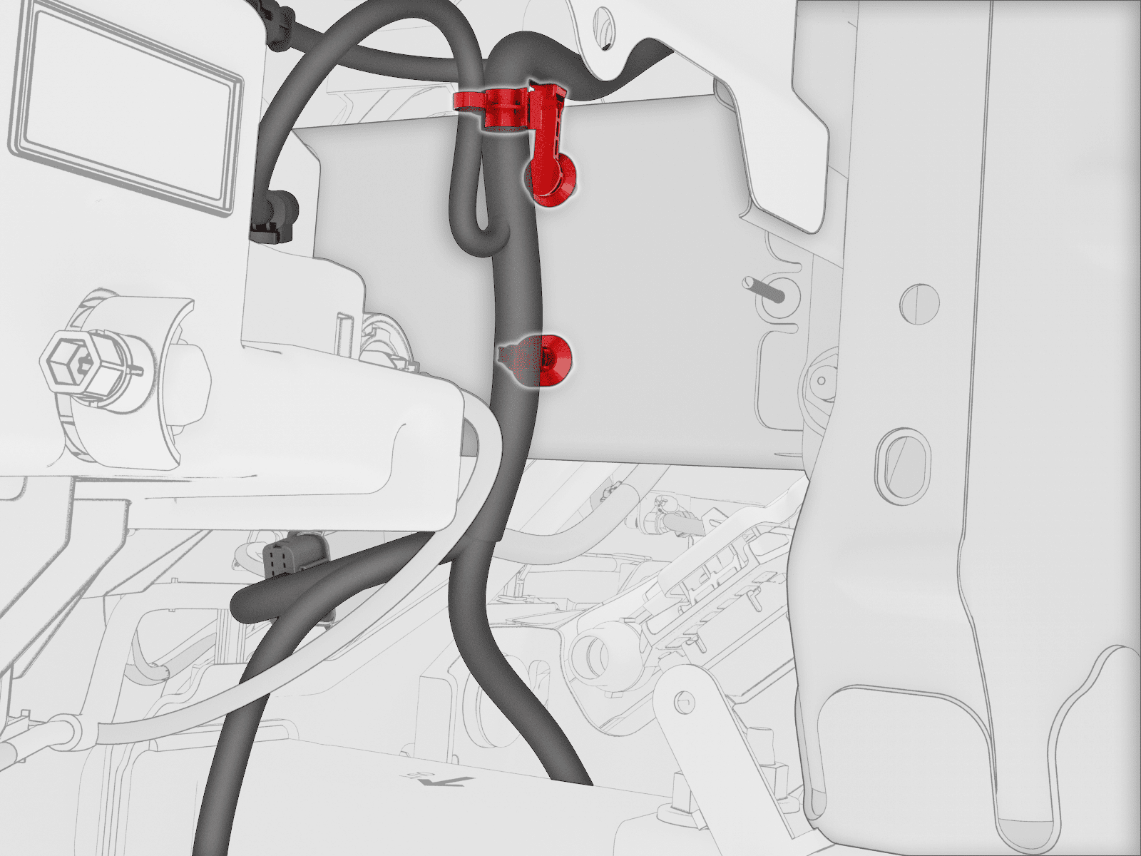 - Install the front harness clips at the rear of the RH front wheel arch area for the side repeater and camera harness.