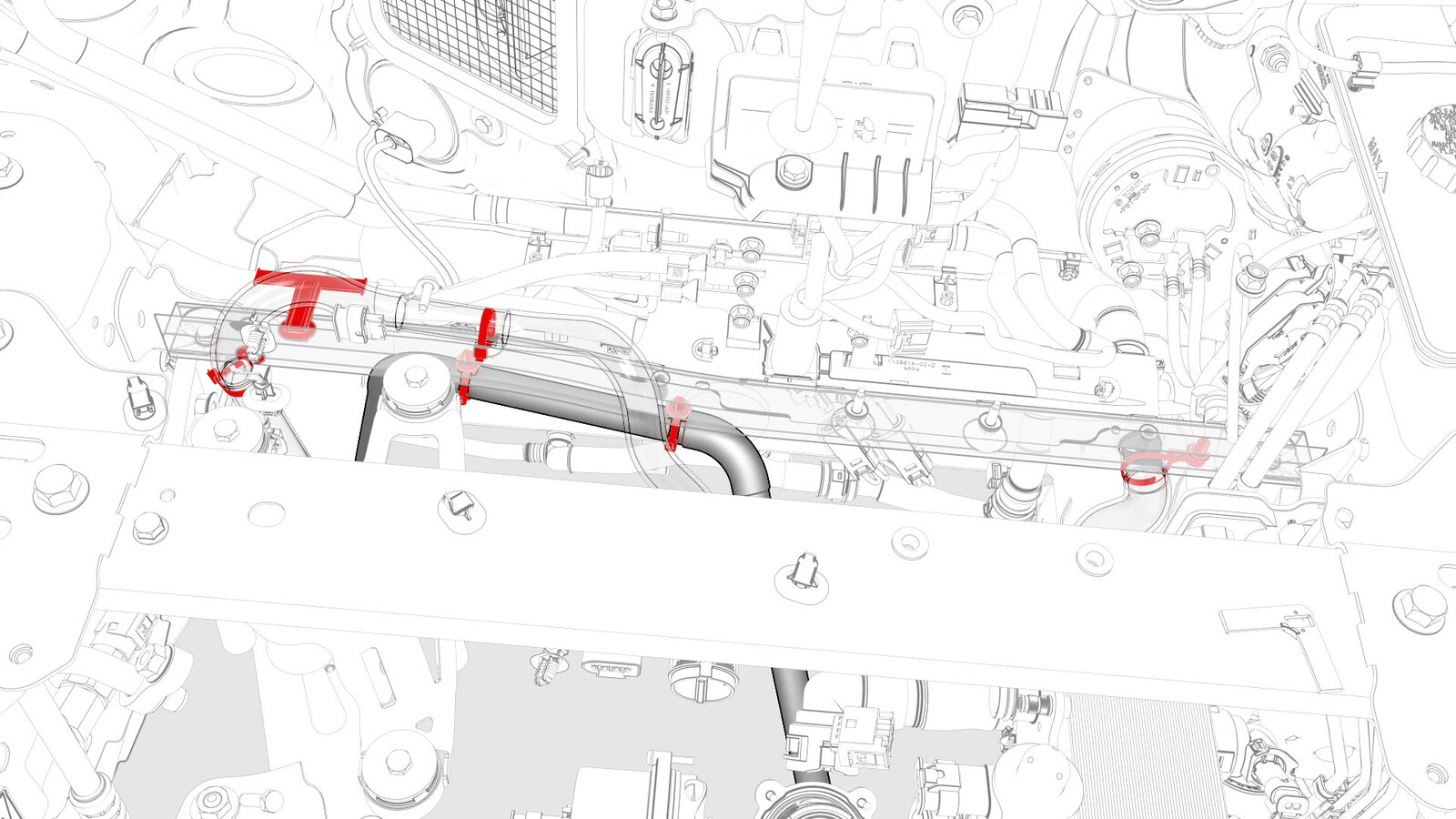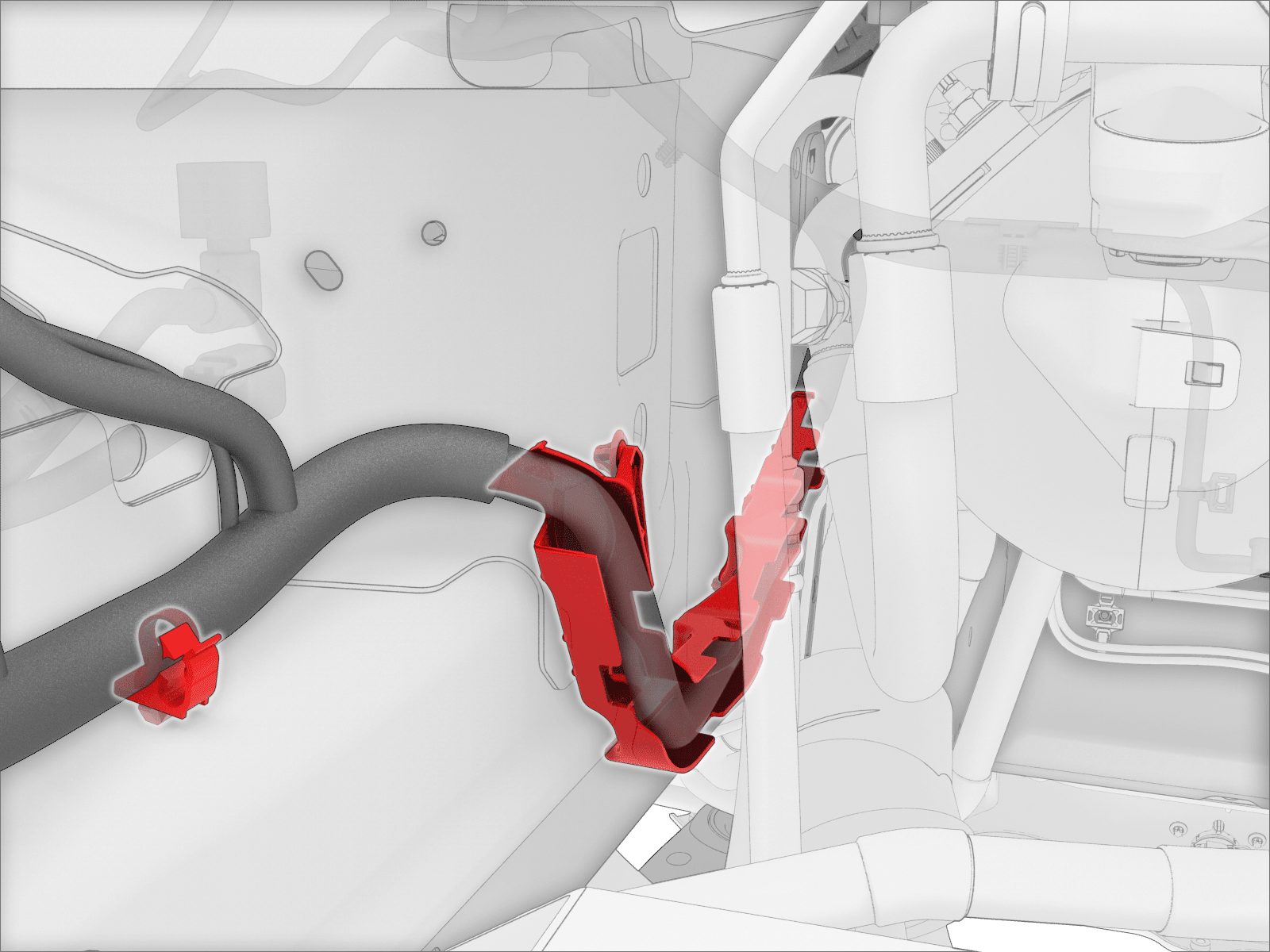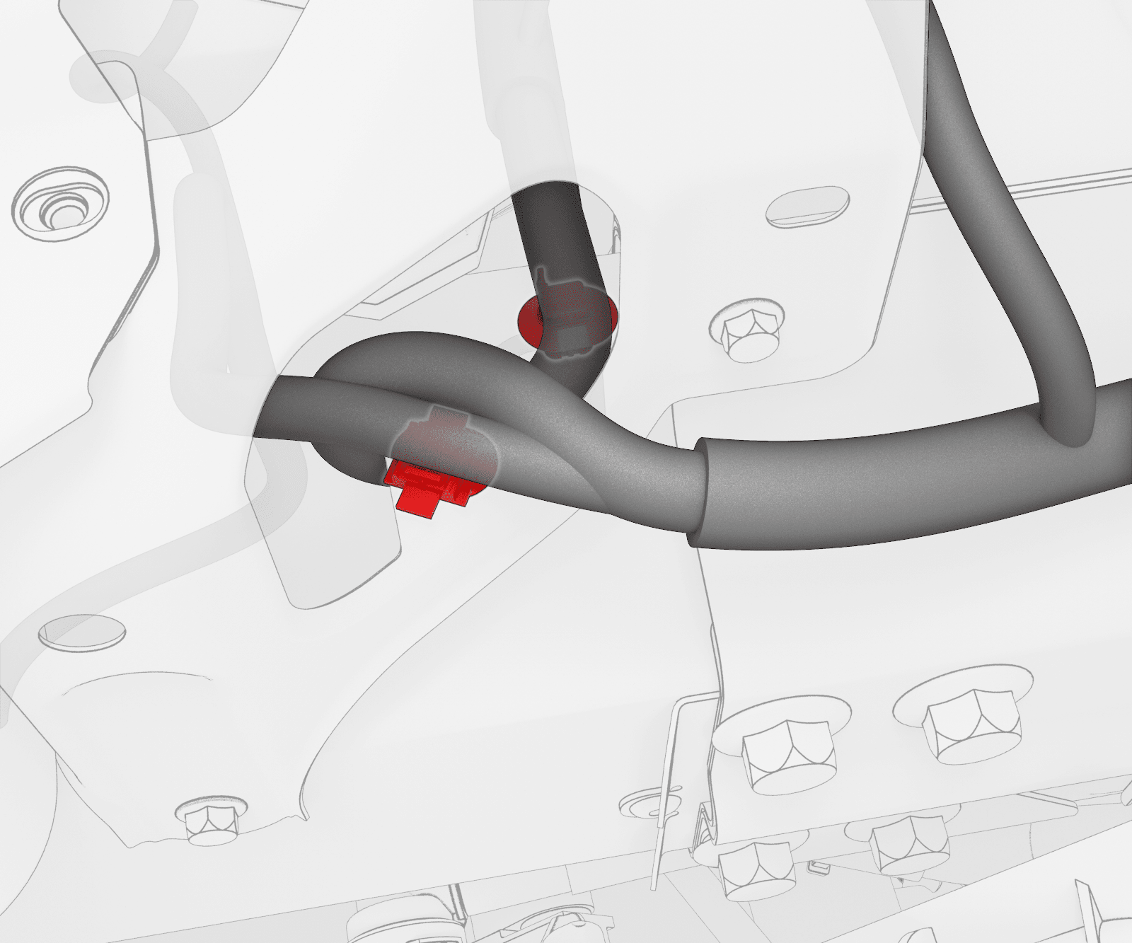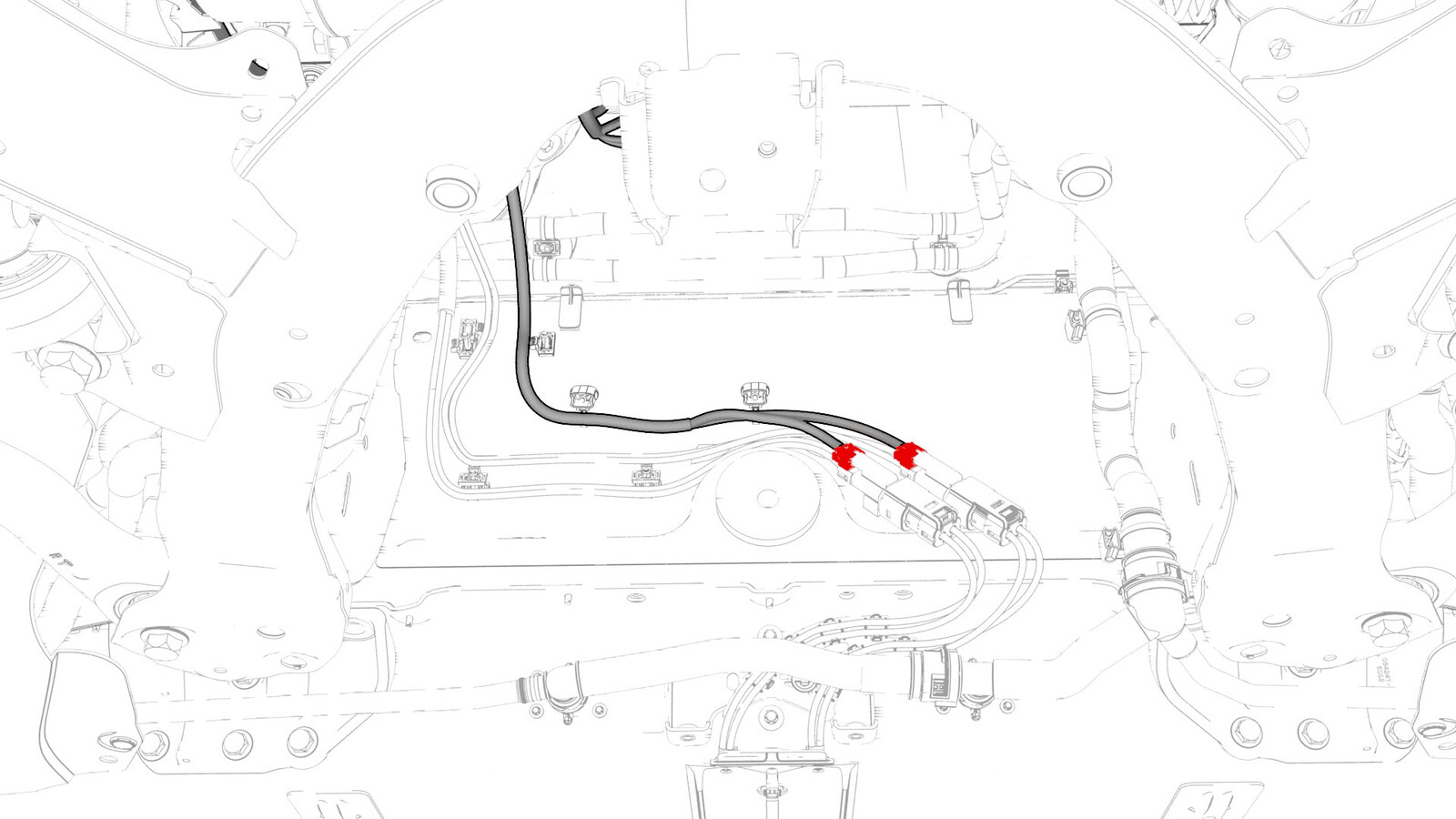 - Install the front harness clips at the rear of the RH front wheel arch area for the side repeater and camera harness.