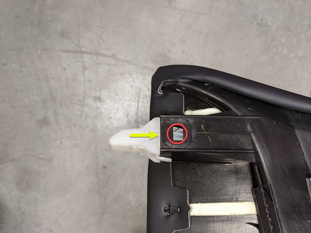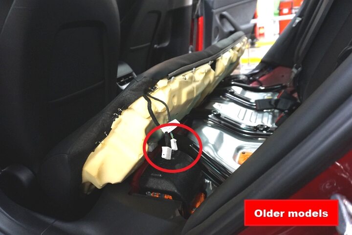 Note2x tabs, 2x connectors, Slide locking tabs to left of vehicle while lifting up seat bench. Newer models have connectors on both sides of bench, Older models have 2x connectors on one side of bench