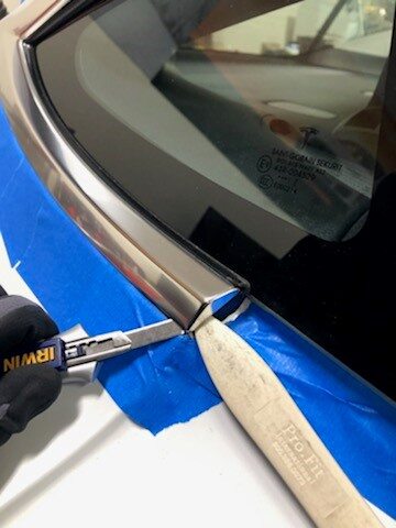 a retractable blade to cut the urethane that attaches brightwork to the vehicle.