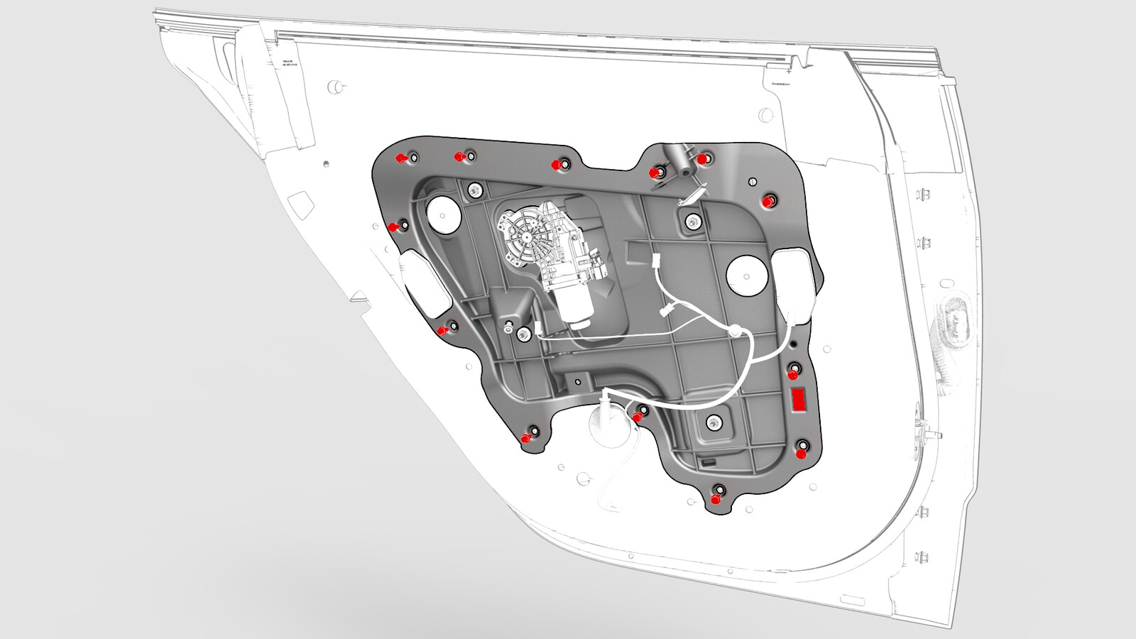 Install the LH rear window motor/regulator assembly to the LH rear door, hand-install the screws (x13) and fasten the metal clip that attach the assembly to the door, and then tighten the screws.4 Nm (2.9 lbs-ft)