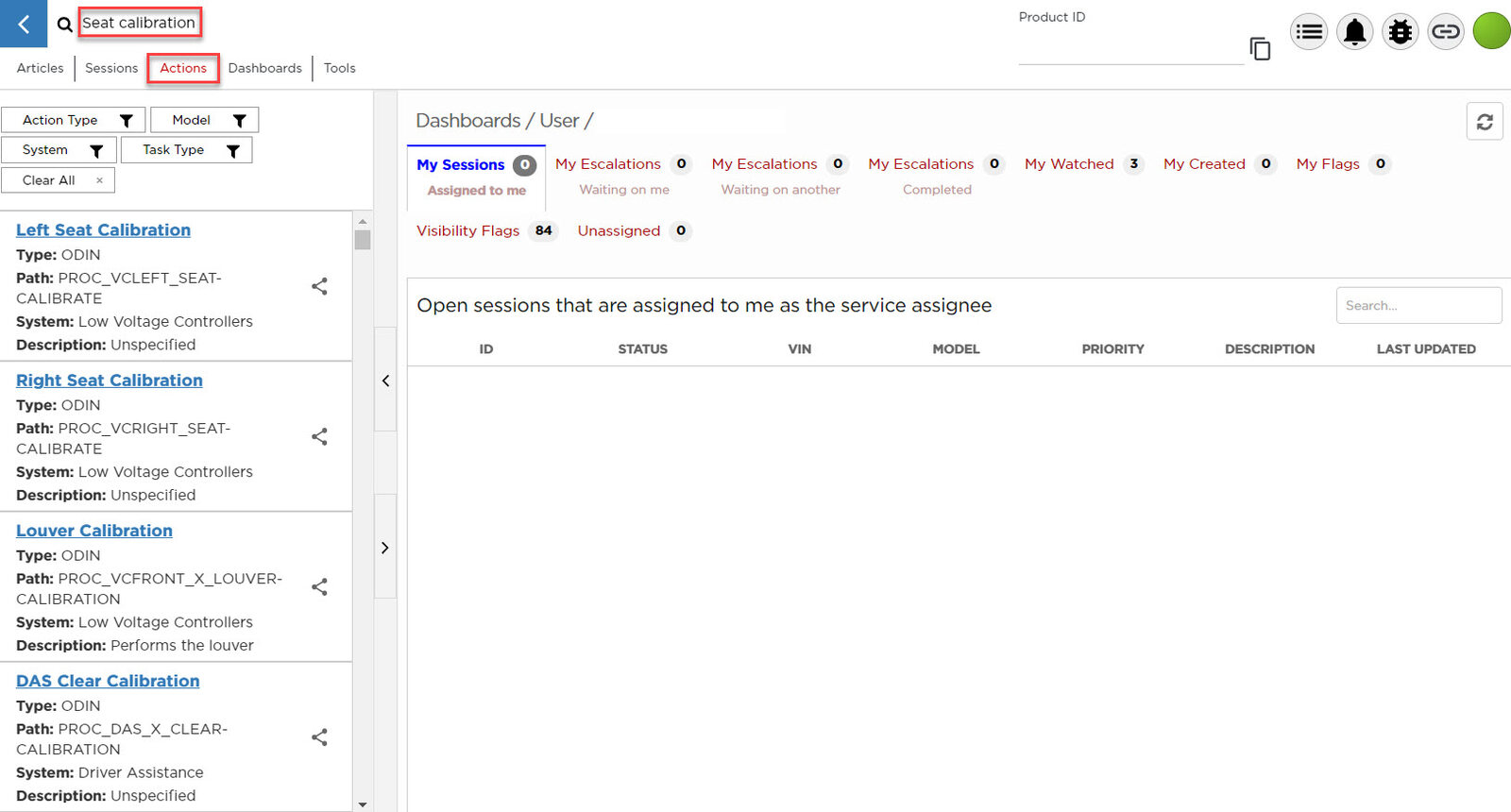 Select ‘Actions’ and search for ‘Seat calibration’