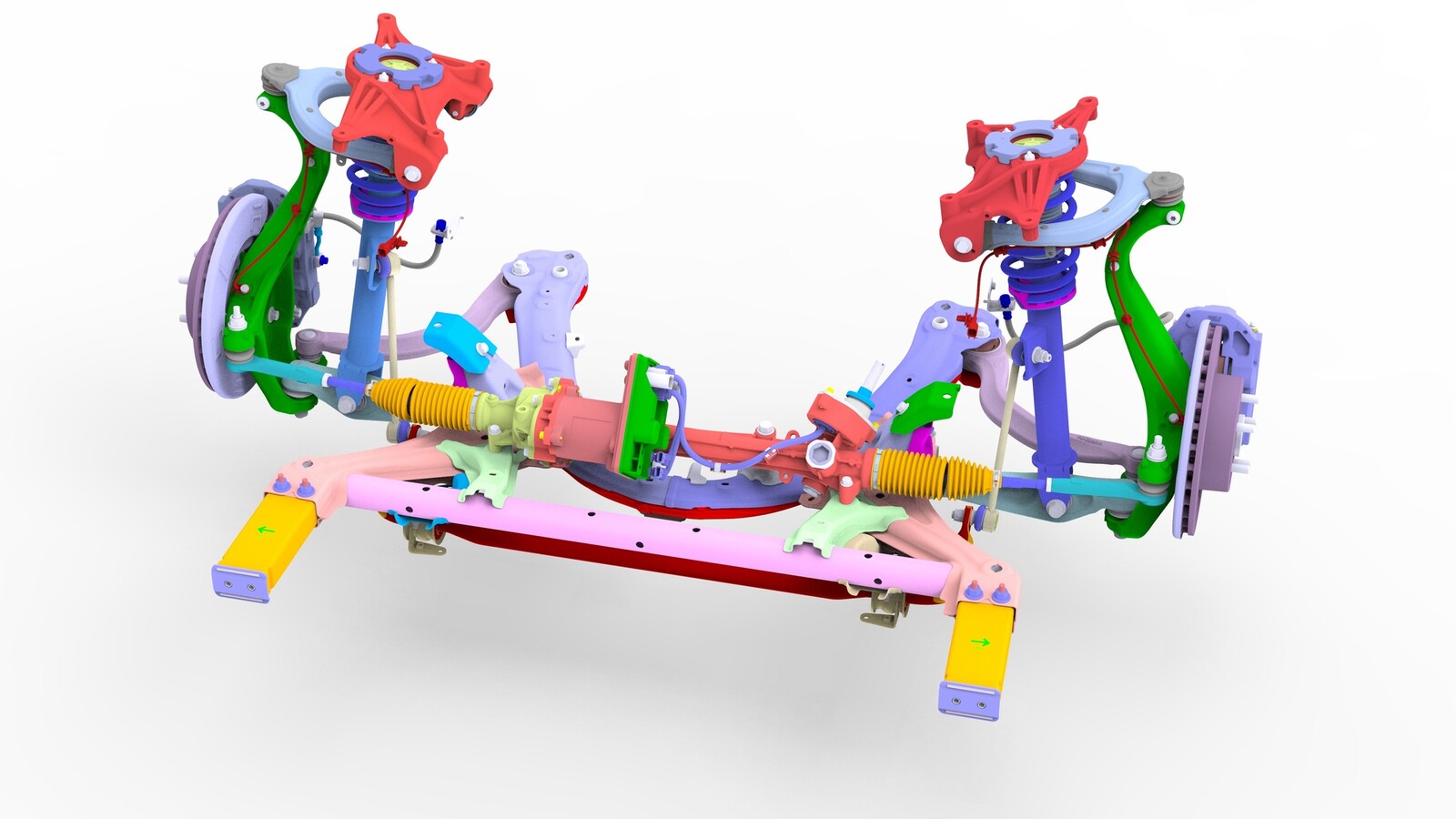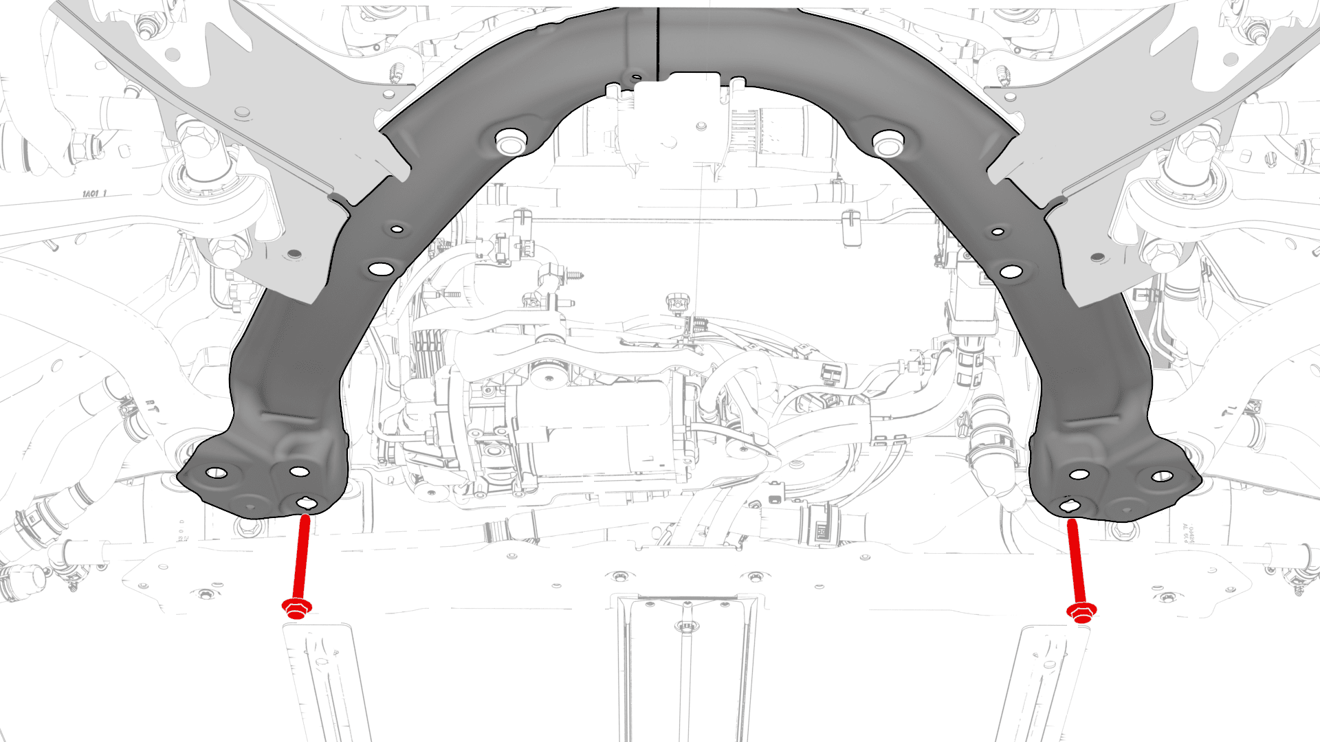 - Put the subframe lifting tool (powertrain table and subframe fixture) underneath the front subframe area.