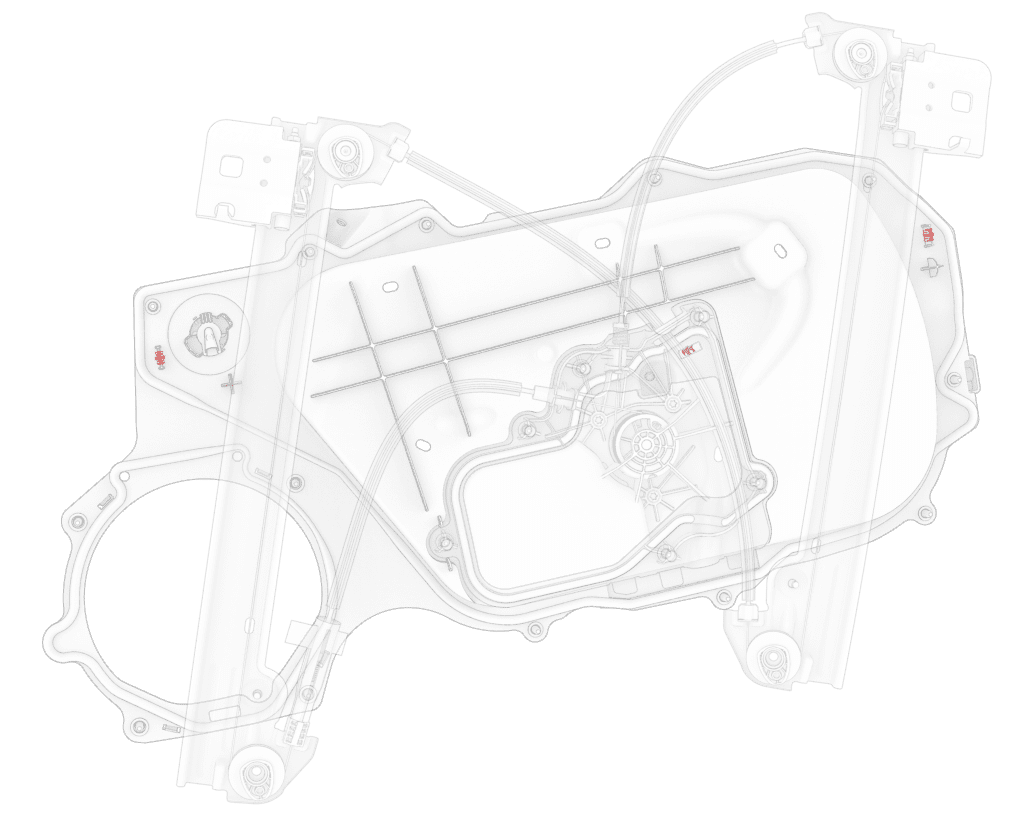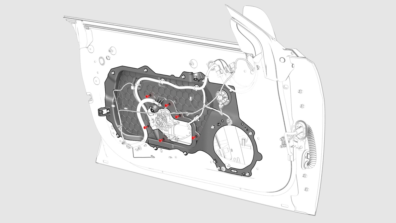 Figure 1. Closeout panel and window regulator shown, other assemblies hidden for clarity NotePass the electrical wiring harness through the hole in the closeout panel, as the closeout panel is being removed.