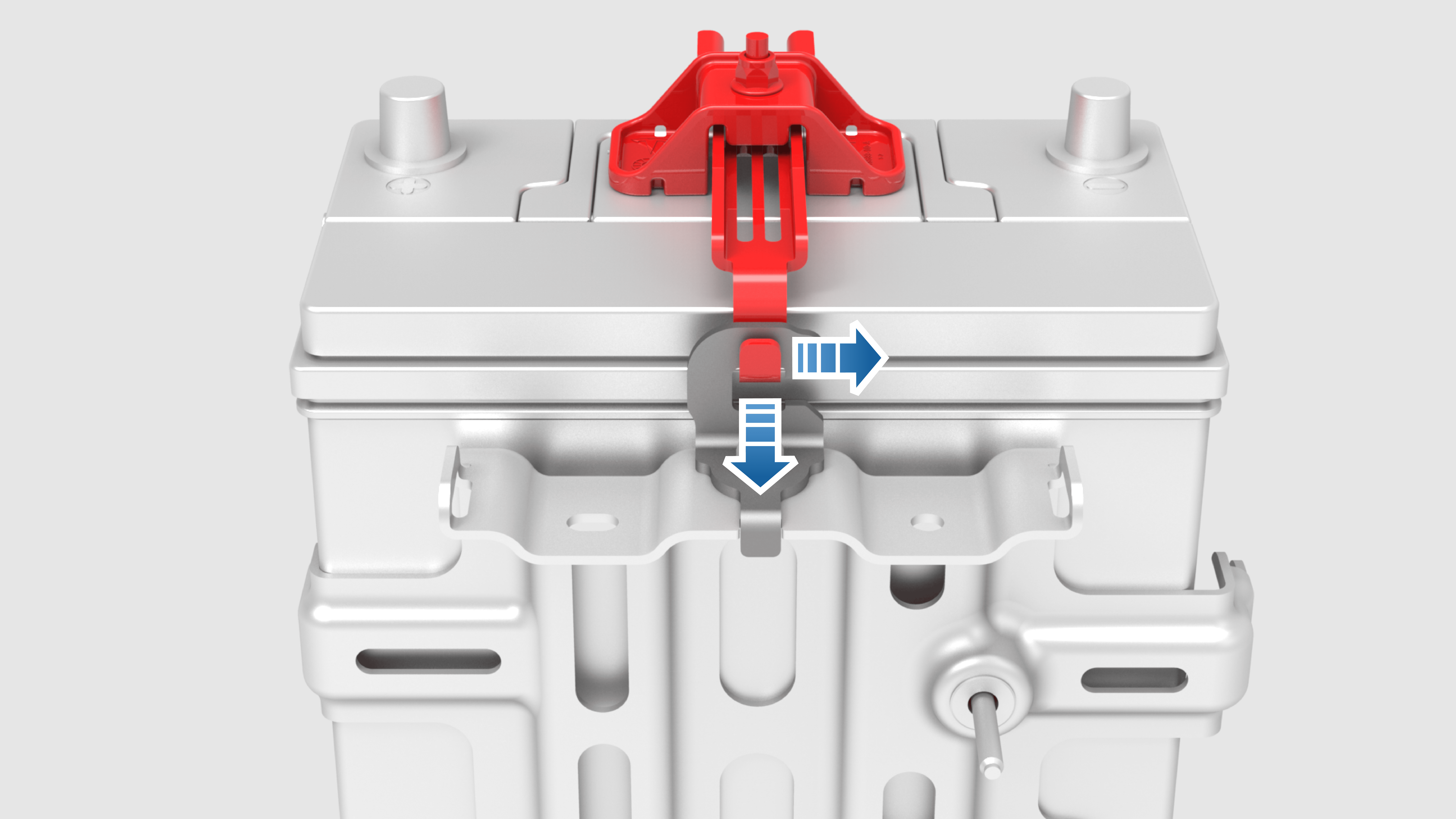 4. Push down and slide the 12V battery strap to the right to release it from the front hook and rear tie down assembly.