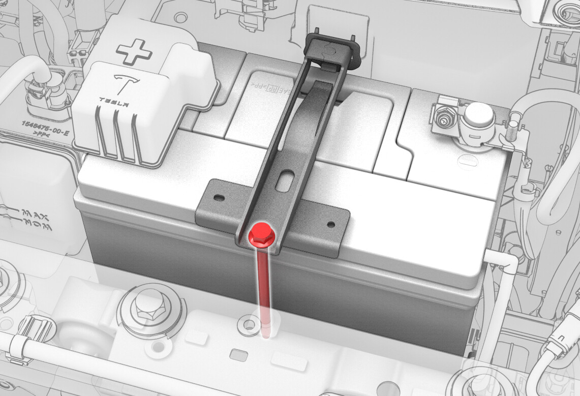 3. Loosen the nut that attaches the 12V battery upper tie down bracket to the 12V battery strap.