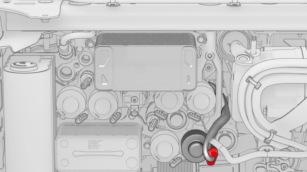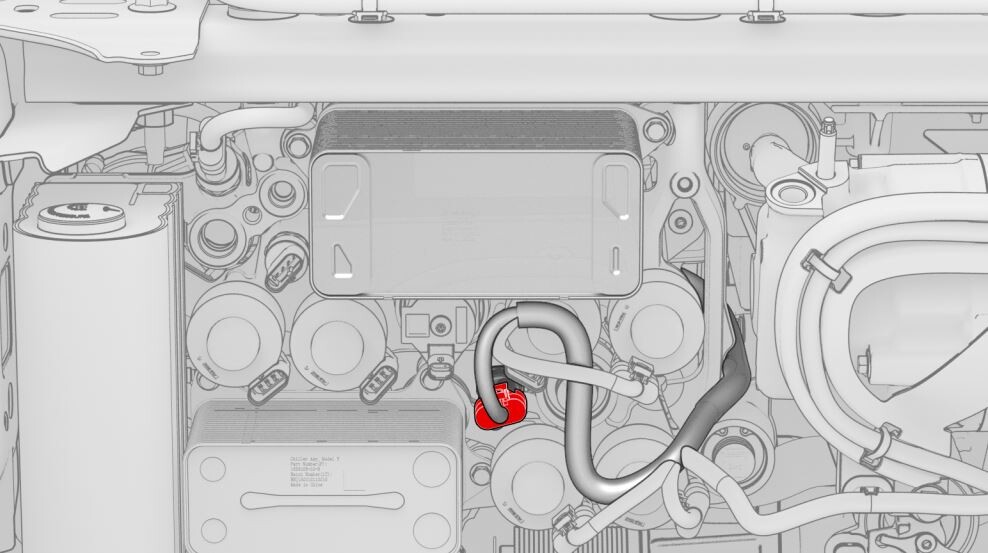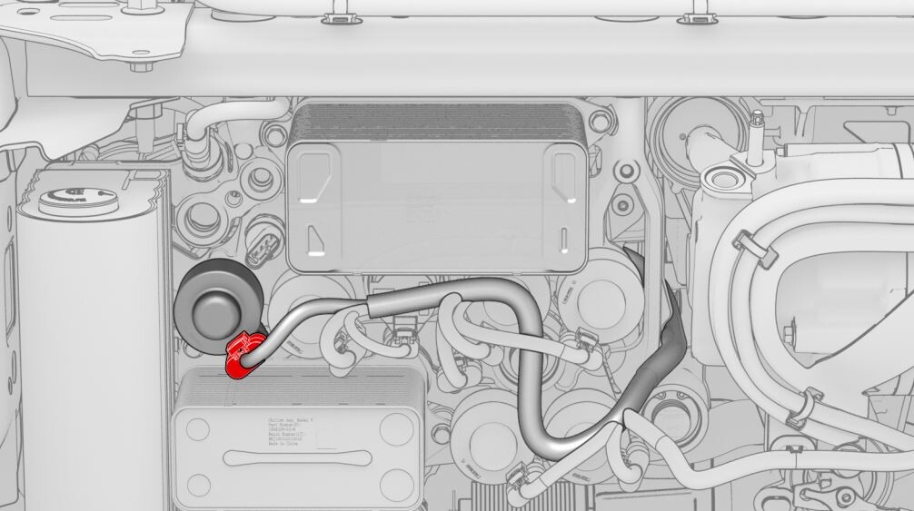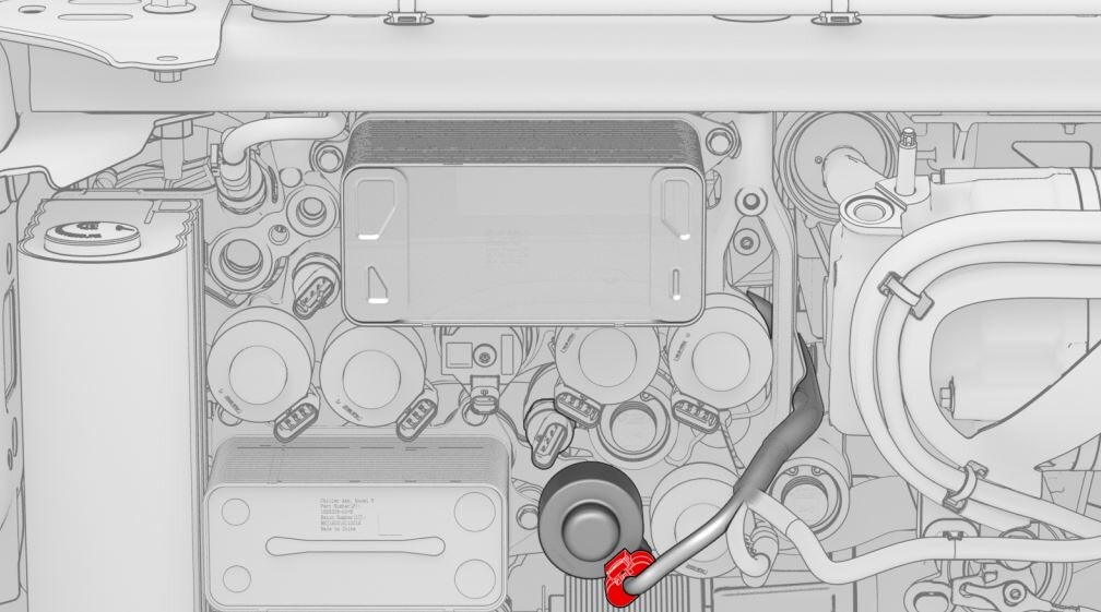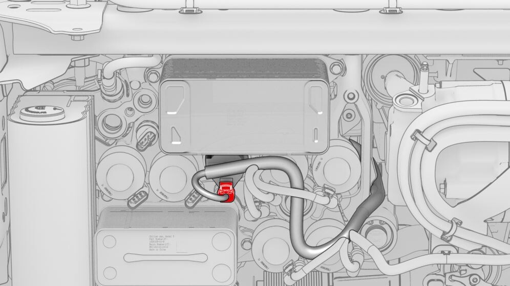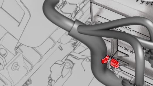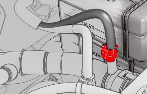 CAUTIONPush the red locking tab towards the connector to engage the locking mechanism. DO NOT push down or pull up on the red locking tab.NoteMatch the color of the tape wrapped around the harness with the color of the sheathe near the coolant hose coupling.