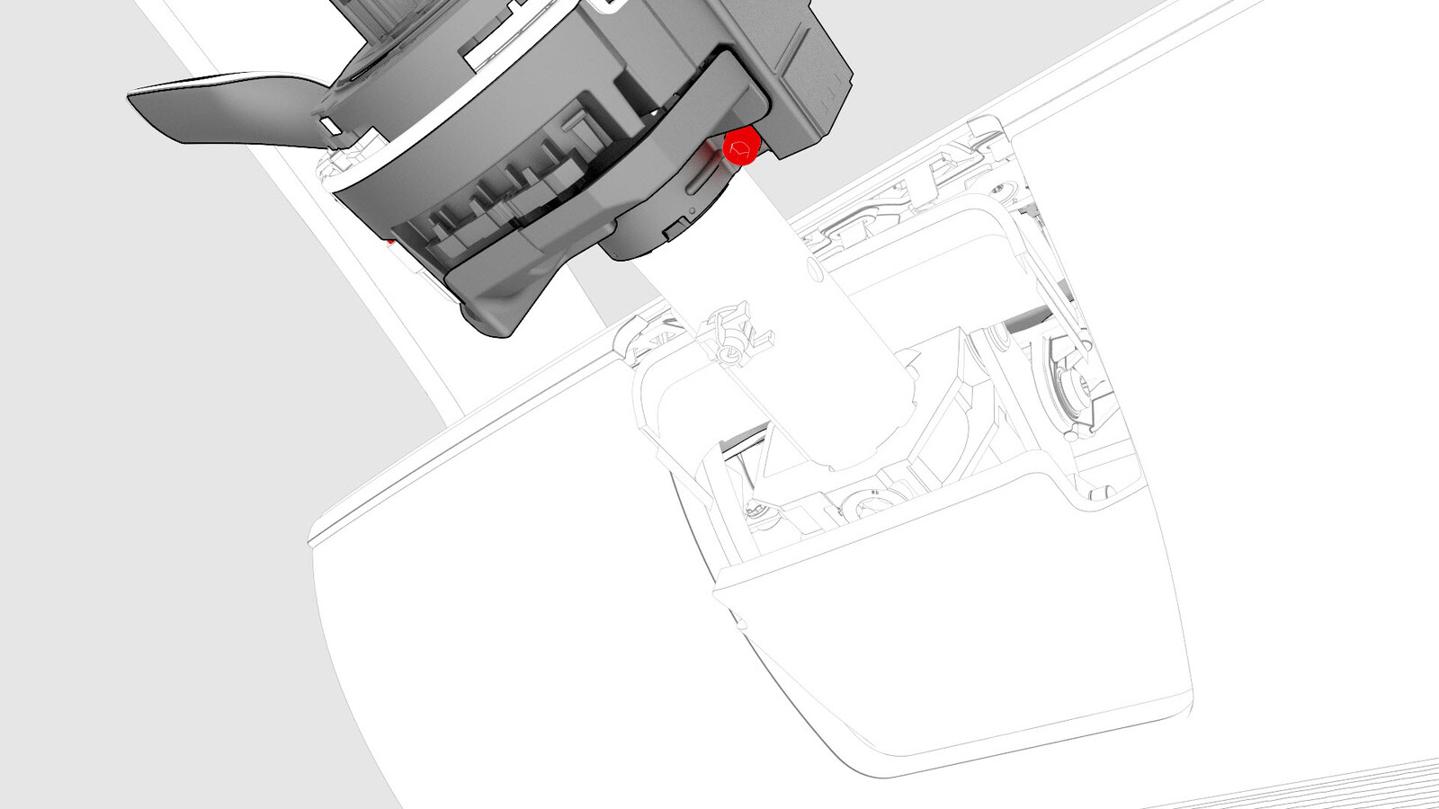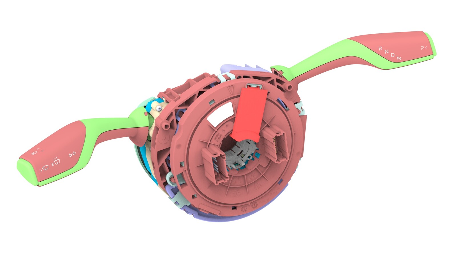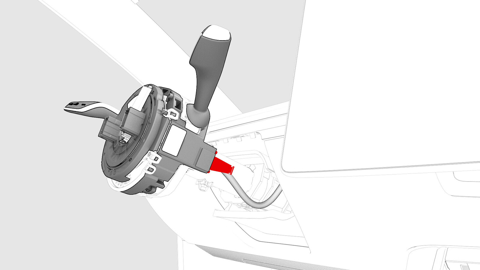 - Remove the red locking tab from the new steering column control module by lifting it off.