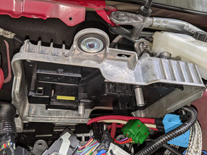 - Remove the battery tie down strap. See Strap - 12V Battery (Remove and Replace).
