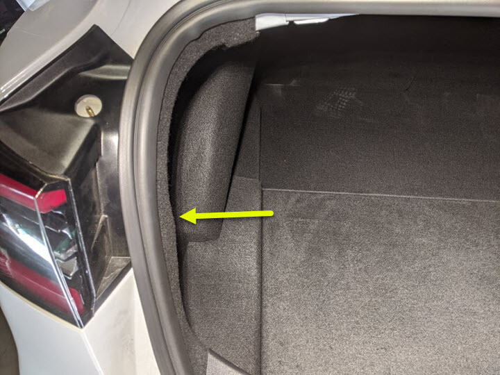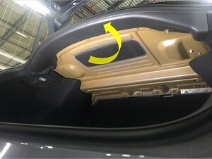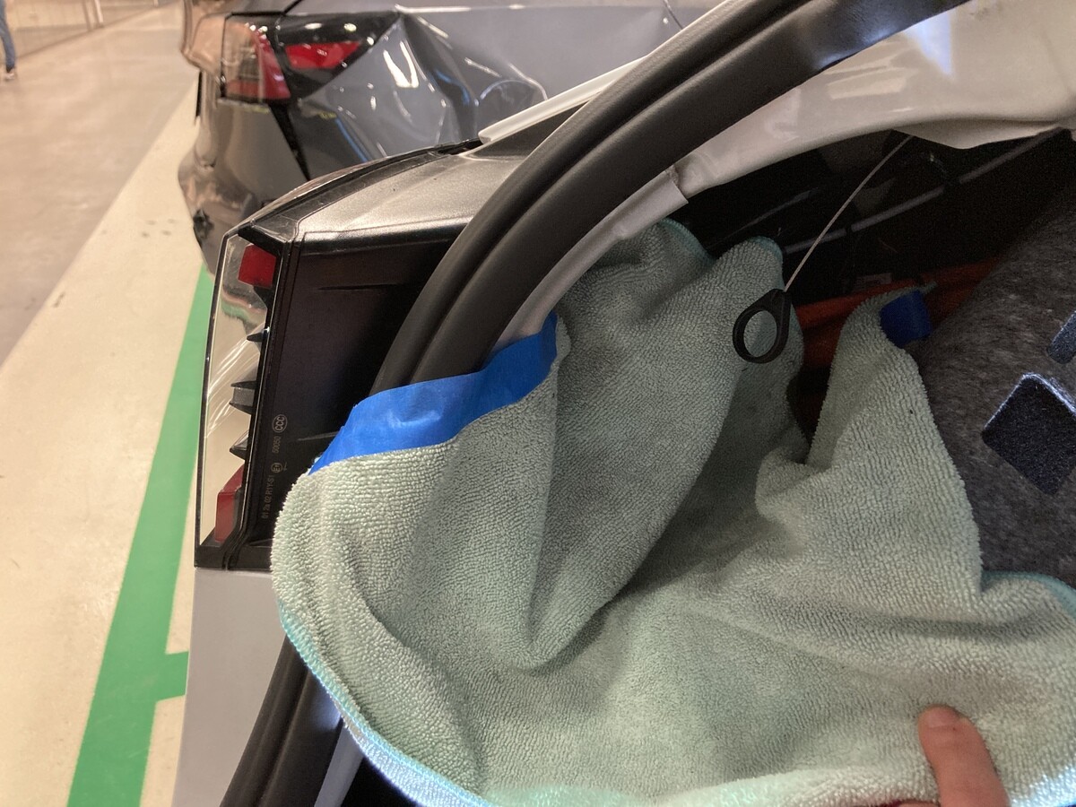 - Remove the shop towel from behind the LH trunk side trim carpet.