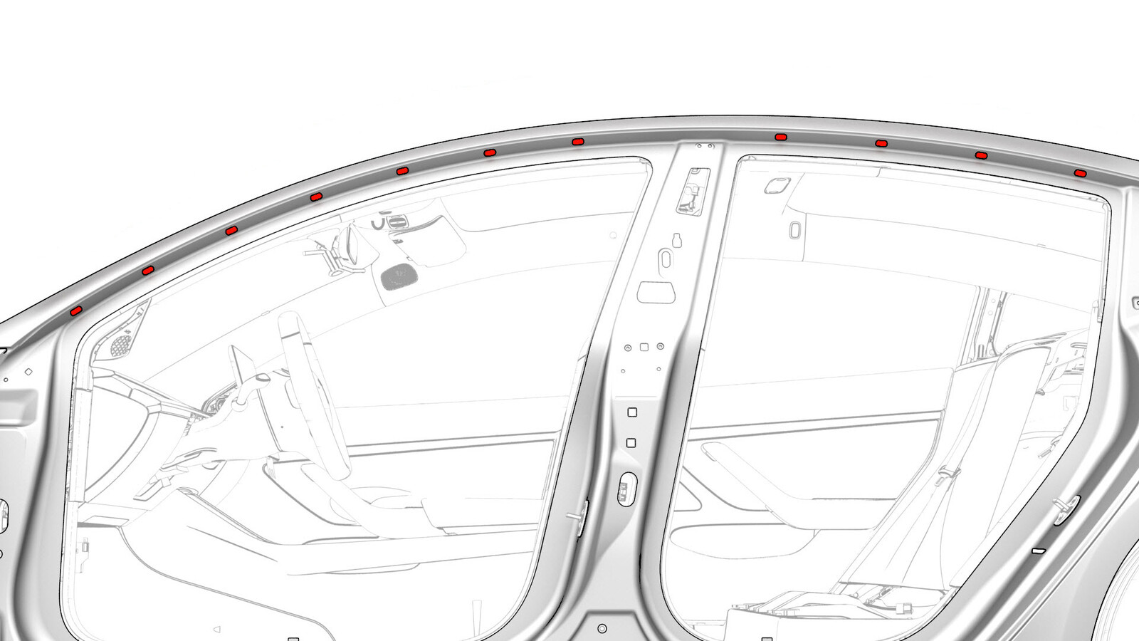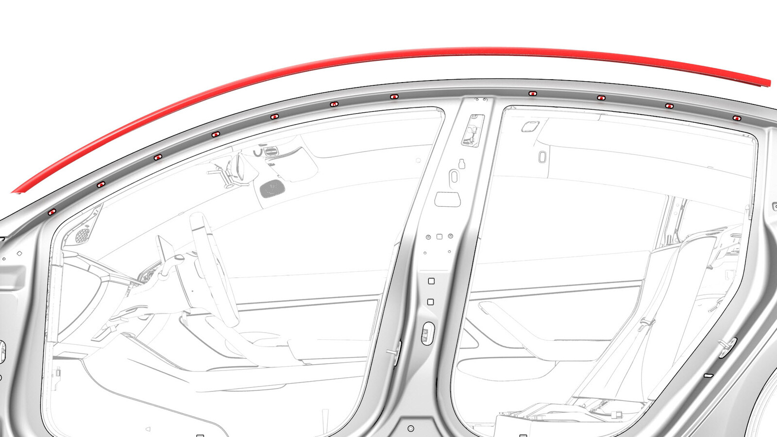 - With assistance, carefully install the LH upper brightwork into the rear quarter glass.