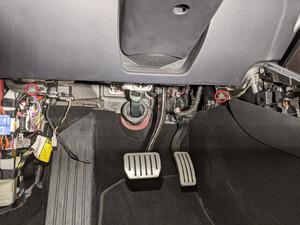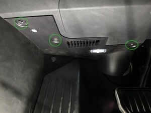 Install connectors to LH footwell cover and position for installation, securing front tabs to driver air bag assembly