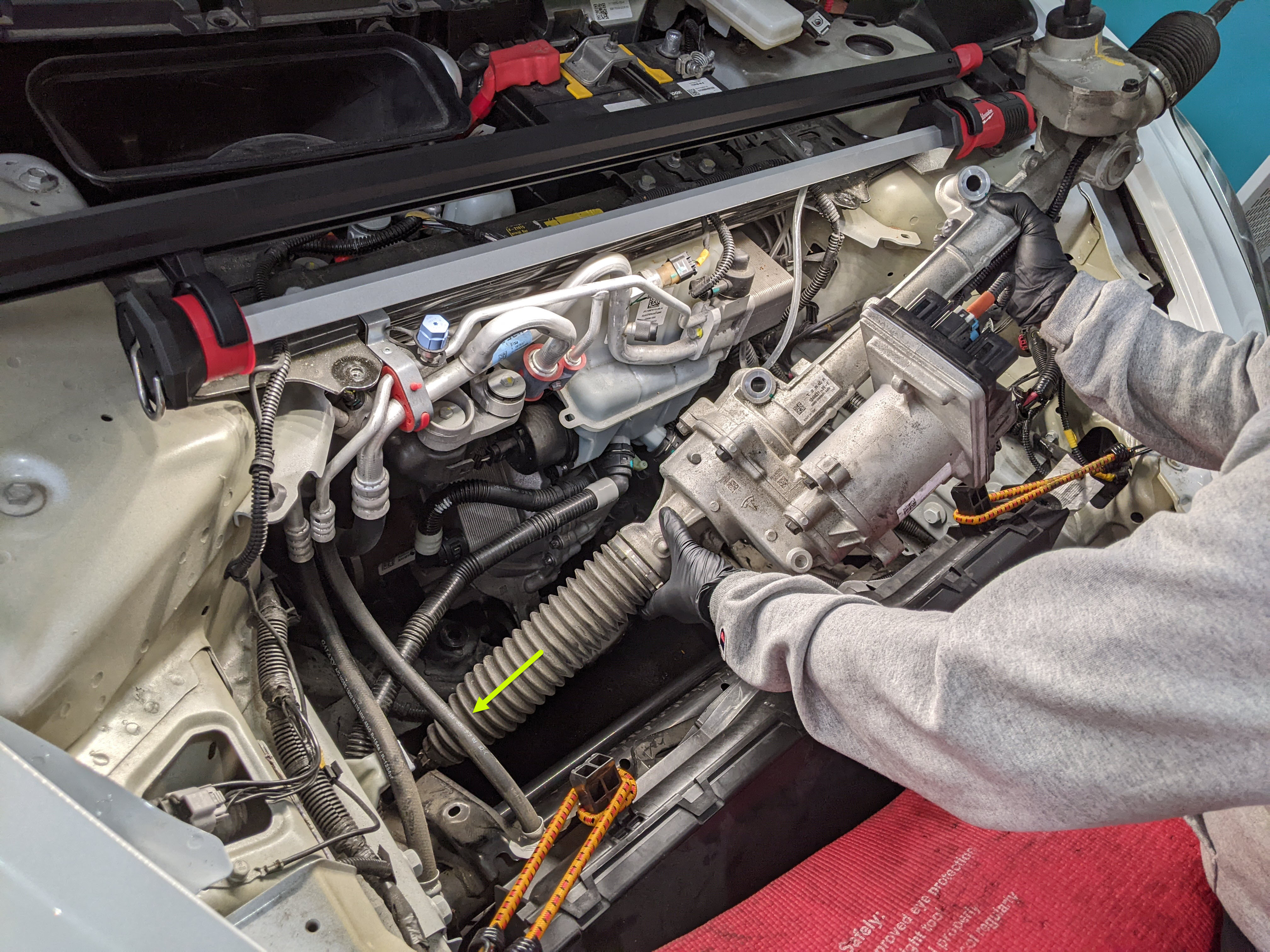 CAUTIONBe careful around the AC lines and superbottle.TIpLift the LH inner tie rod up first, and then maneuver the rest of the rack out of the underhood storage unit opening.TIpMake sure the LH side of the coolant hose is below the LH inner rod to ease removal.