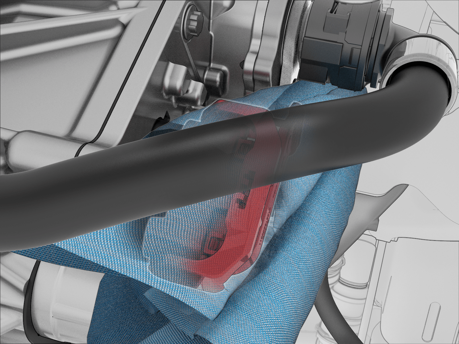 - Remove the shop towel from underneath the front drive unit upper inverter coolant coupling.