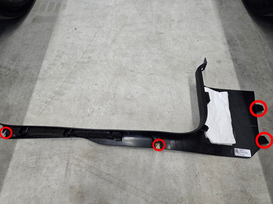 Note4x clips, 1x connector, Frunk safety switch, 3x guide tabs, Align 3x tabs then push downward to secure clips