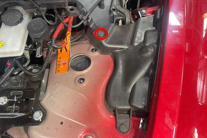Figure 12. Model 3 shown; Model Y similar. Wheel arch liner removed for clarity. - Lower the vehicle so that the shock tower is accessible. If the lift cannot be locked in that position, set the lift to its lowest lockable position and use a step stool to gain access to the shock tower.