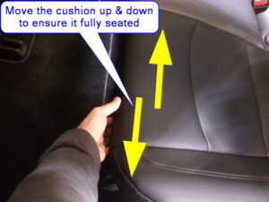 Note2x connectors, 2x clips, Insert the seat belt buckles through the holes, Slide rear cushion inward then align front guide tabs to locking tabs, Make sure cushion is fully seated with push & pull test near clips