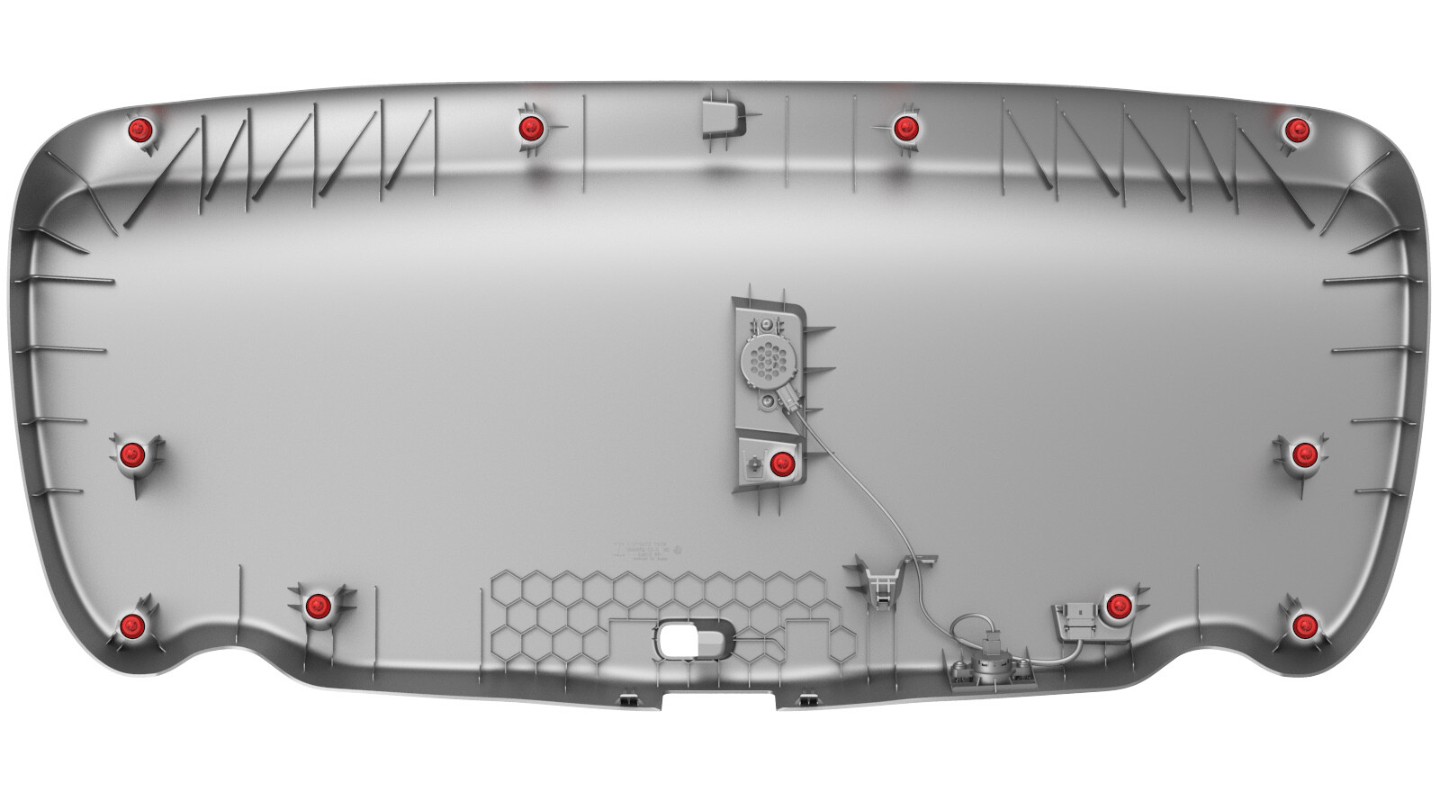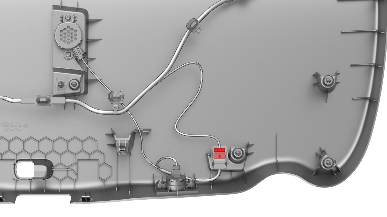 CAUTIONSupport the trim while releasing the clips, as the power trunk switch harness is still connected to the trim.NoteThe clips (x4) closest to the rear window have a higher retention force; use a clip prytool, if necessary. Remove any broken clips from the trunk lid.