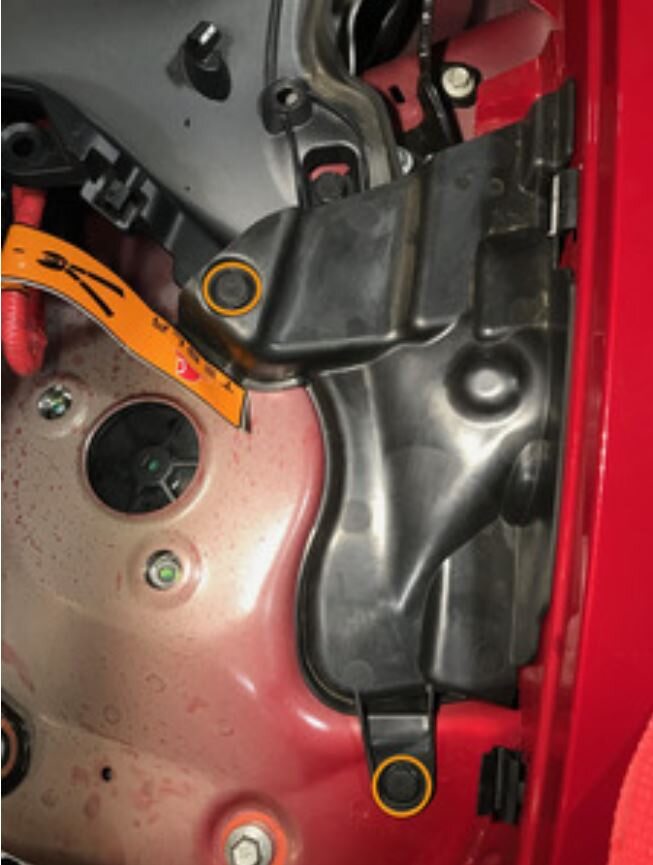 Note7x bolts, 10mm, 5 Nm, Lift up RBN covers to access upper fasteners, Newer vehicles may not be equipped with covers