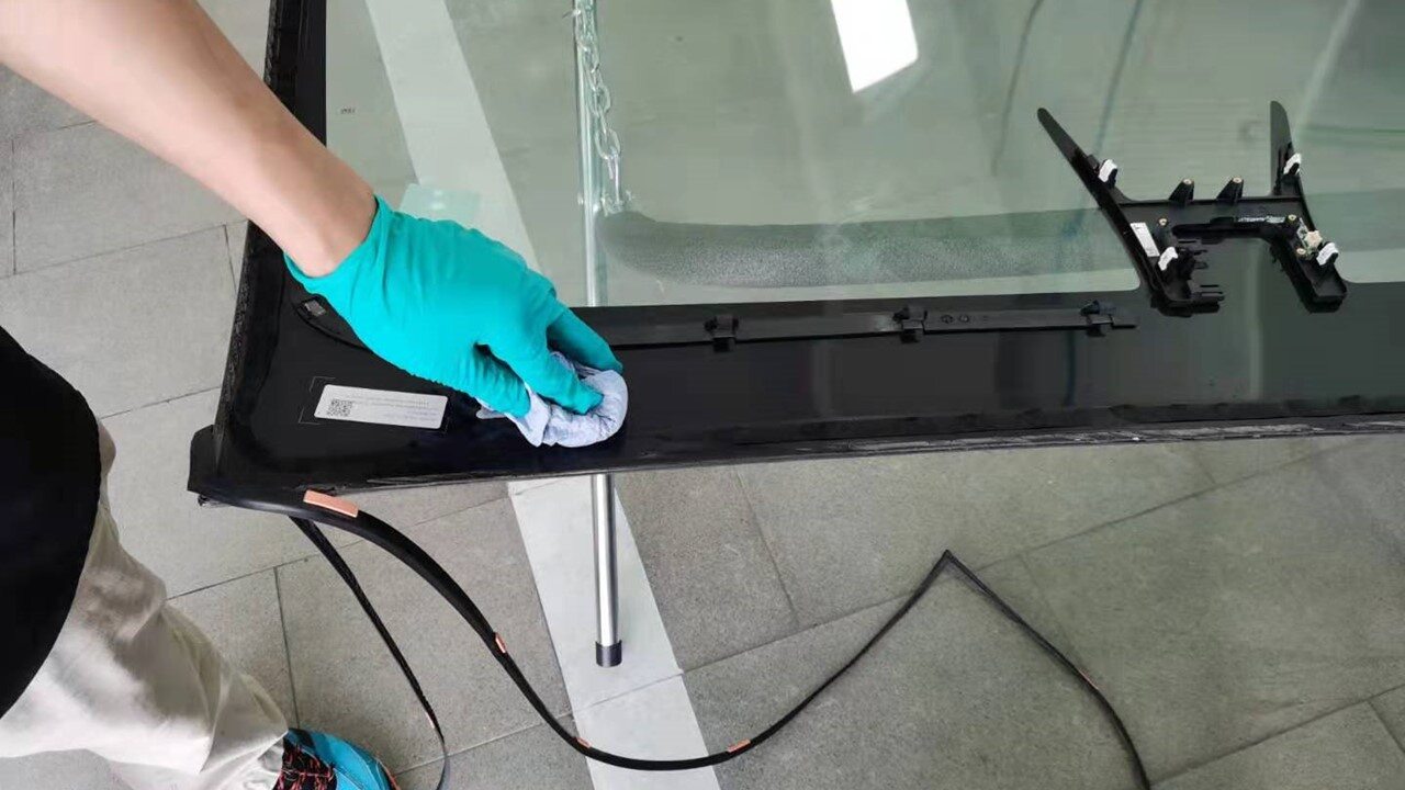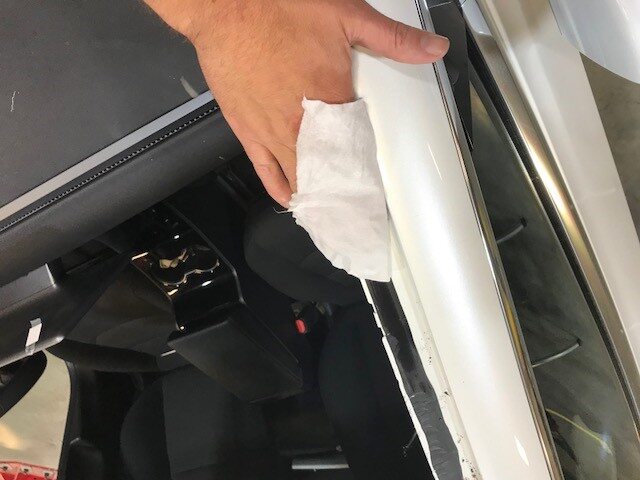 Apply urethane primer to windshield and vehicle body along old urethane path