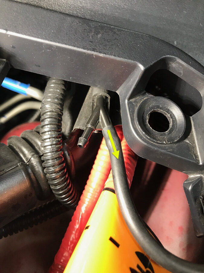 Disconnect washer hose from RH wiper arm to Y-tube fitting and release washer hose clips