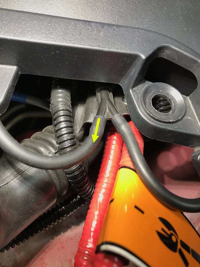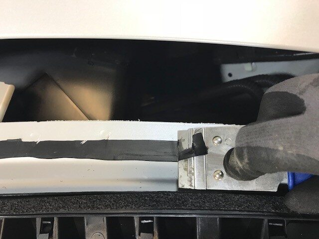 Secure line to starter tool and push tool through urethane at lower RH side of winshield