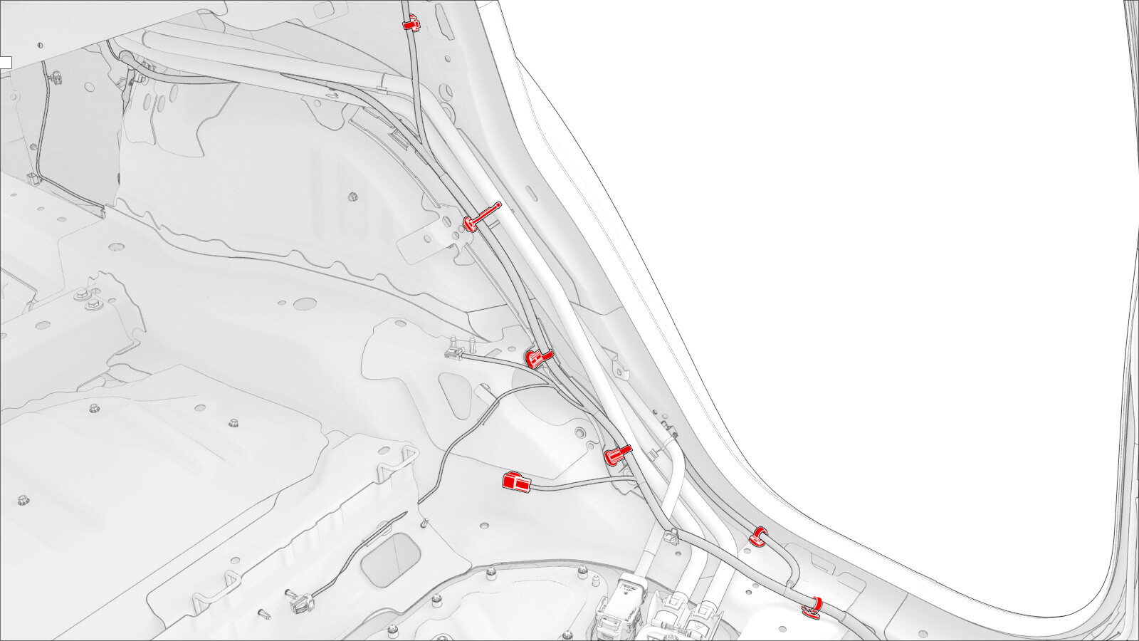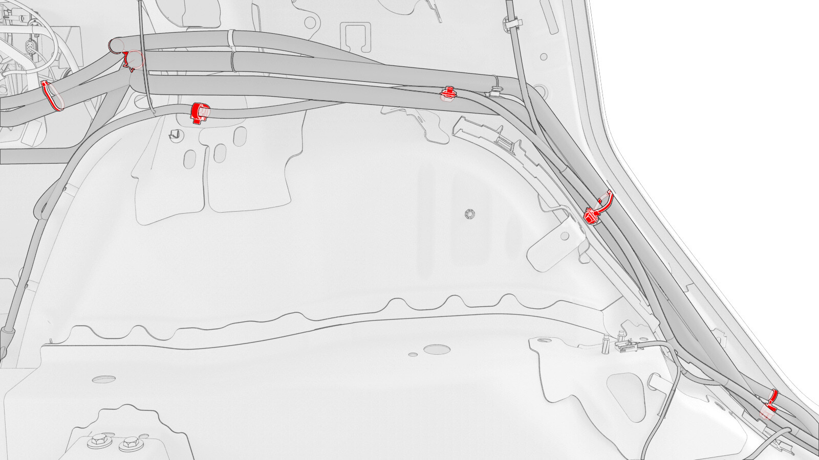 NoteThe LH body harness passes through the trunk near the rear section of the rear LH wheel liner area.