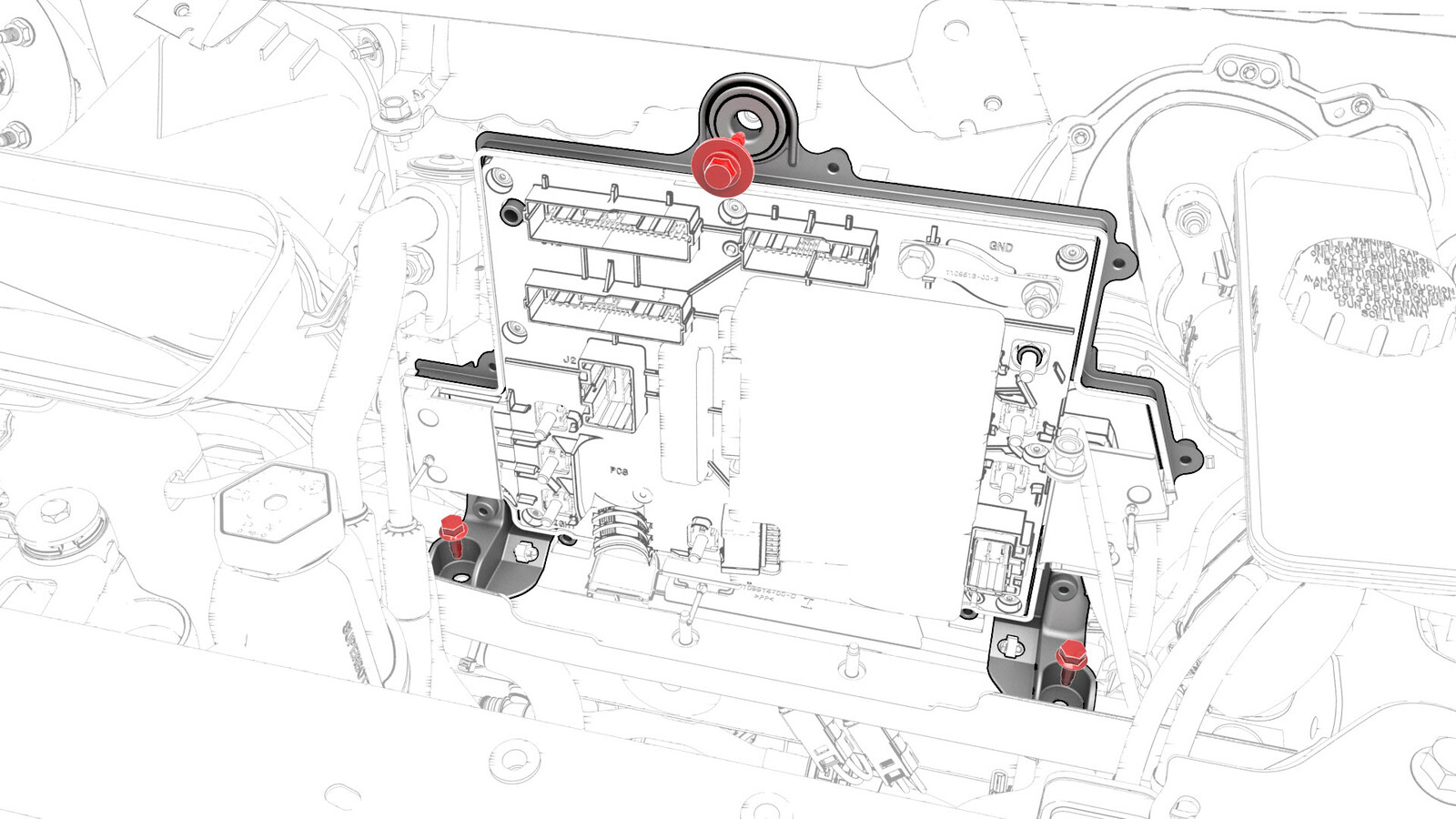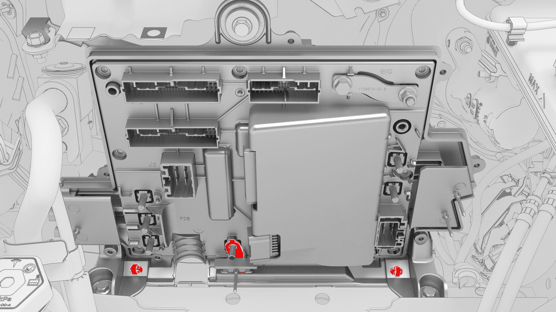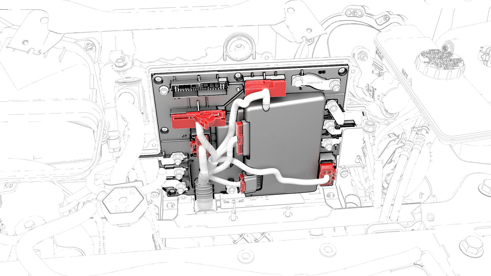 Slide the busbar onto the lower stud, and then fasten the electrical harness clips (x2) to the bottom of the front body controller module.