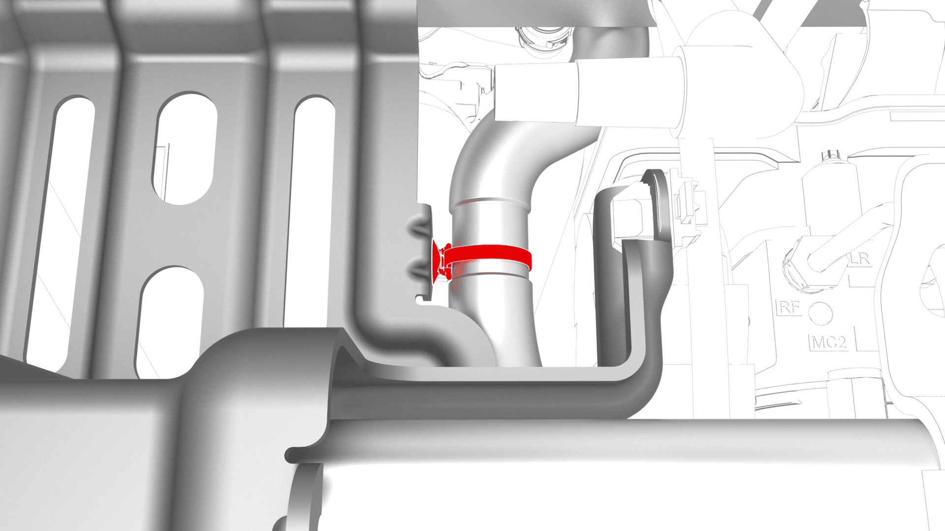 Fasten the clip that attaches the coolant hose to the 12V battery bracket.