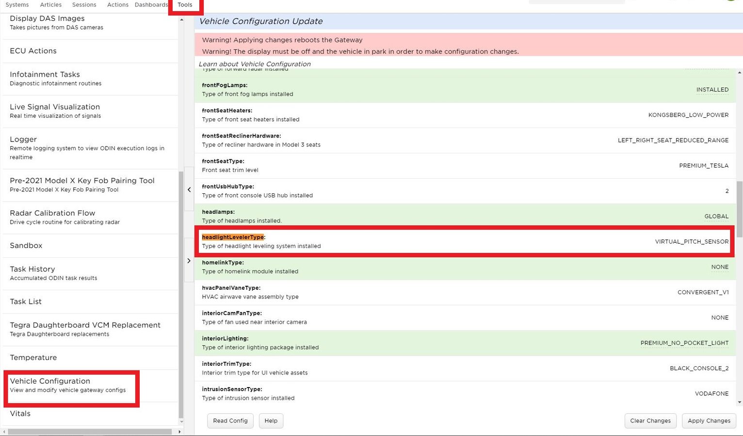 and confirm the "headlightLevelerType" configuration is "VIRTUAL_PITCH_SENSOR".