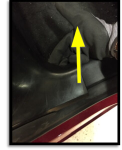 Note1x clip, 2 guide tabs, Pull rear of lower A-pillar upward to release clip then pull rearward to release front tabs from carpet