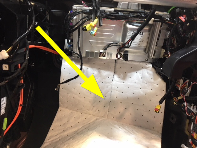 NoteWith right hand on top of car computer and left hand under car computer, use back of right hand to help push air bag assembly up and towards back of vehicle. Take care to not damage air bag connections or wiring harnesses