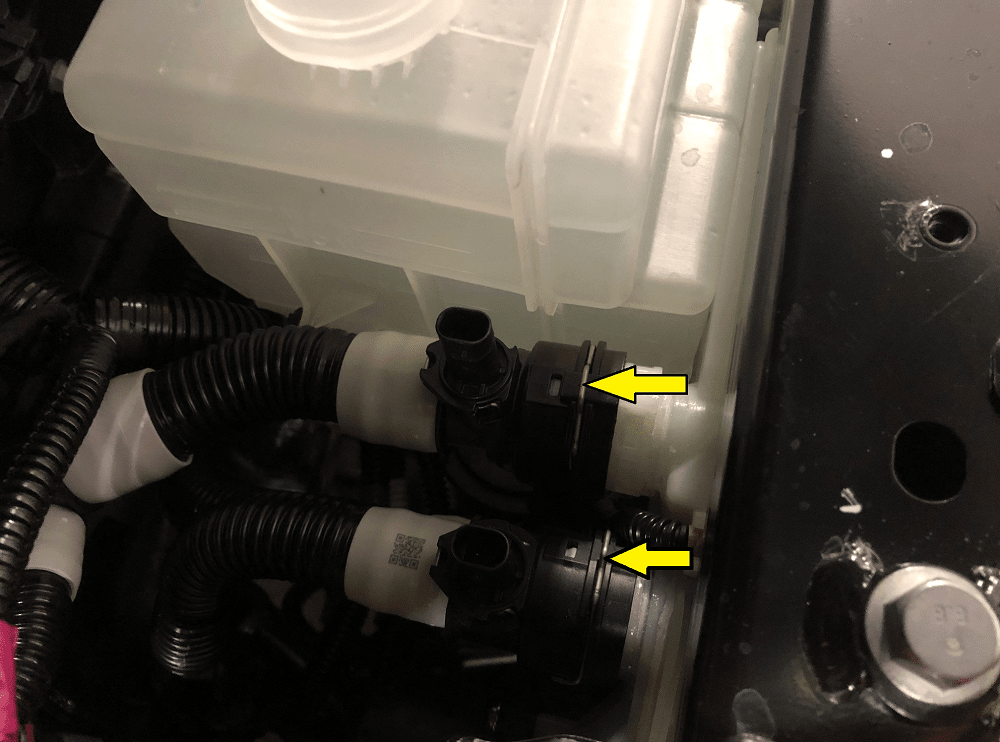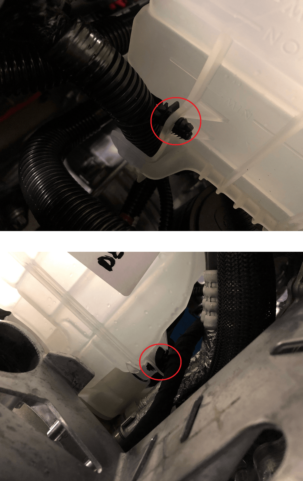 rear and front of the coolant reservoir that secure the coolant reservoir to