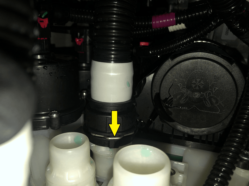 NoteLubricate coolant reservoir O-ring with silionce lubricant and verify that the O-ring is properly seated on the collant reservoir outlet pipe.