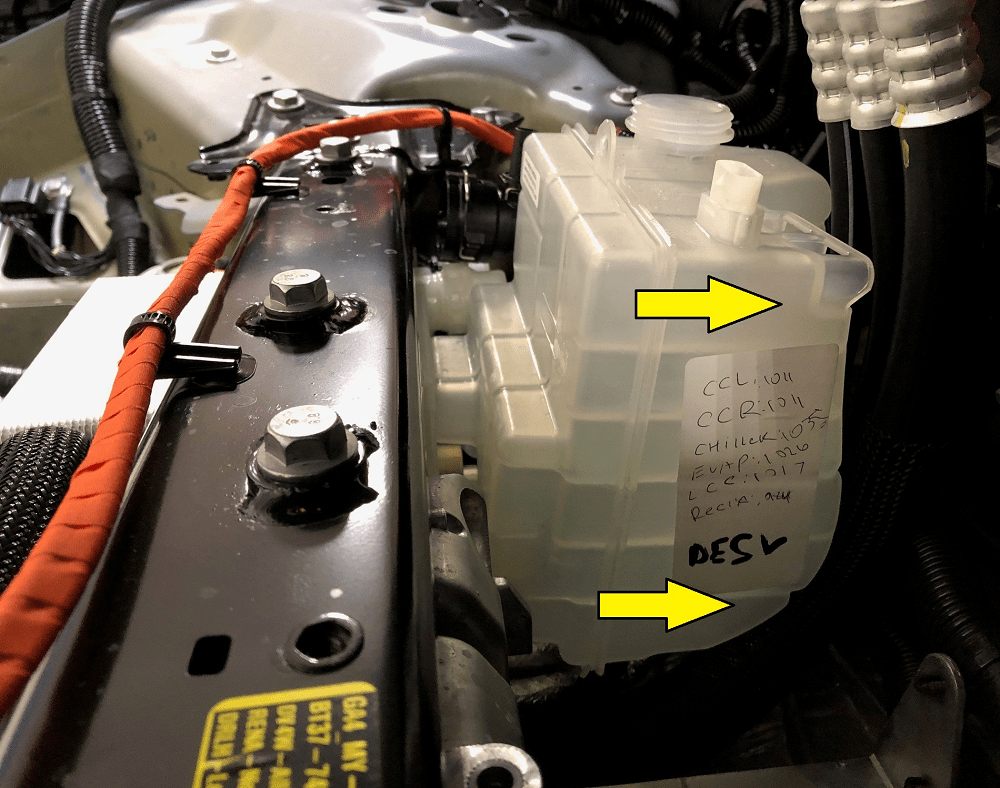- Inspect coolant level, top up to the MAX line on the reservoir as required, and then install the coolant reservoir cap.