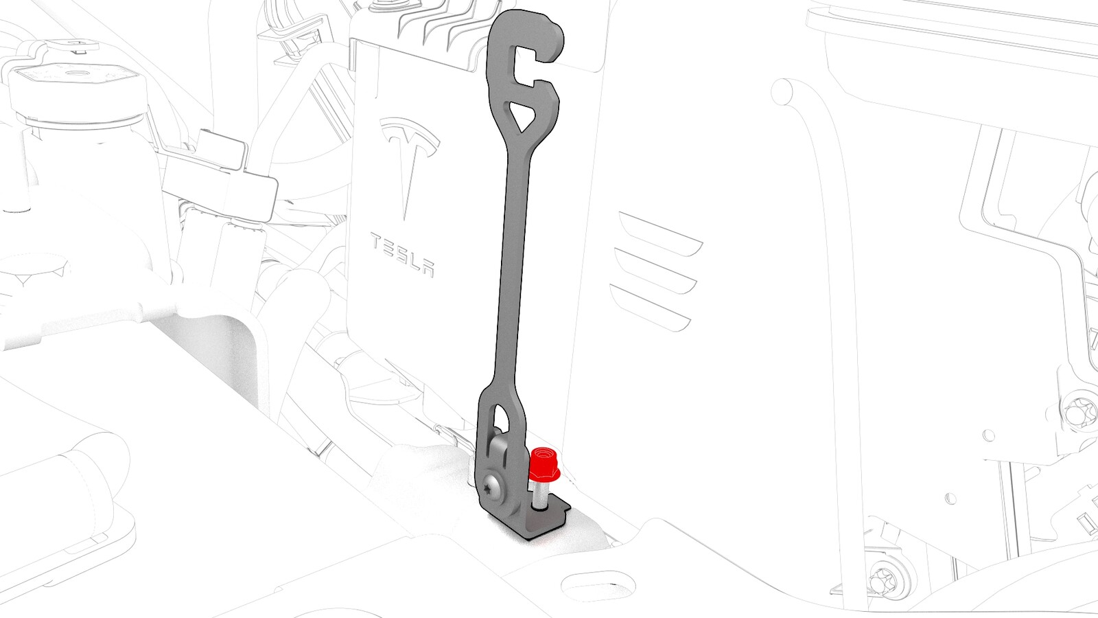 Remove the bolt that attaches the 12V battery rear hook tie down to the body, and then remove the tie down from the body.