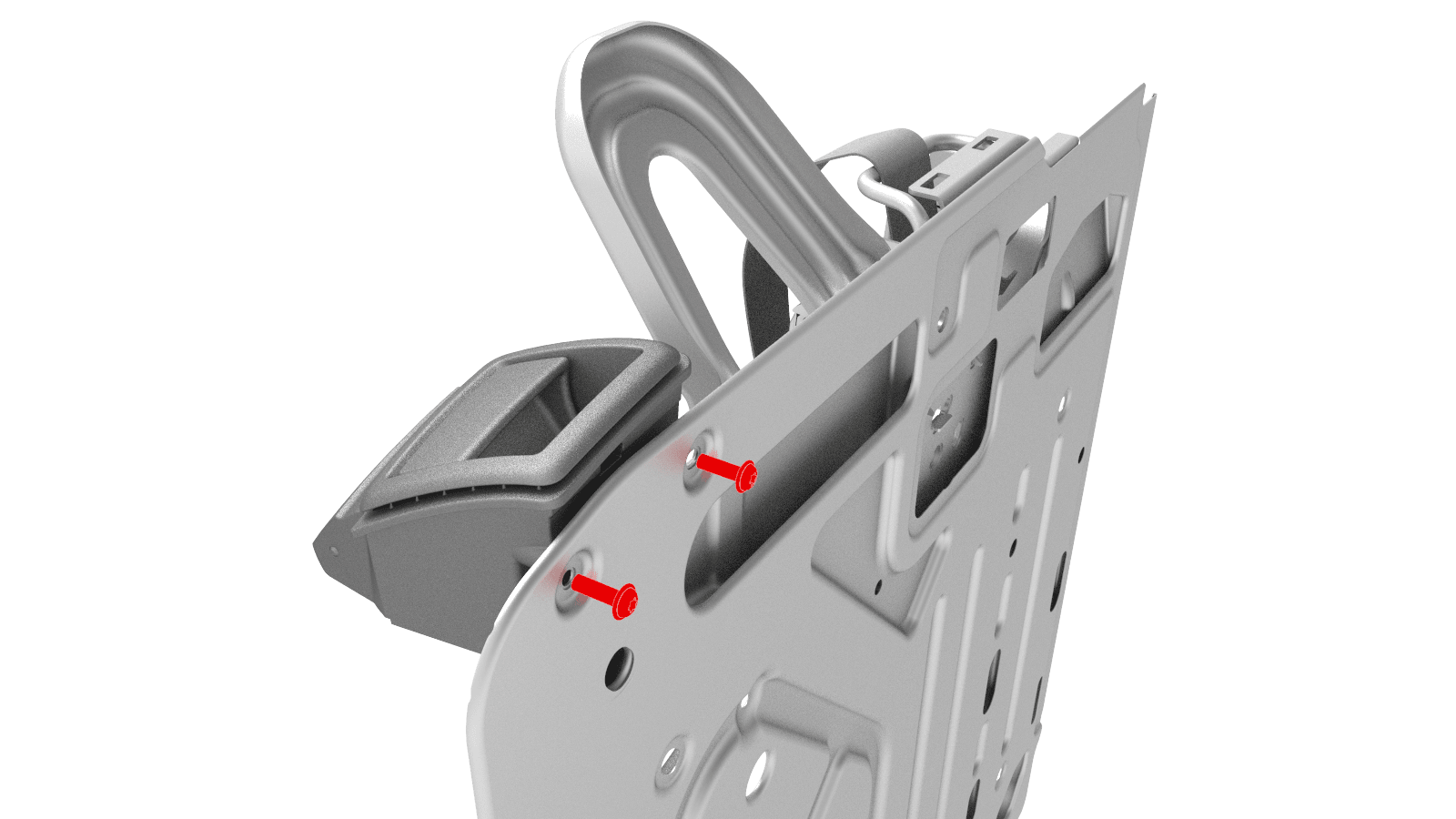 Slide the LH 2nd row seat back handle assembly onto the LH 2nd row seat backplate, and then install the bolts that attach the handle assembly to the backplate.2 Nm (1.5 lbs-ft)